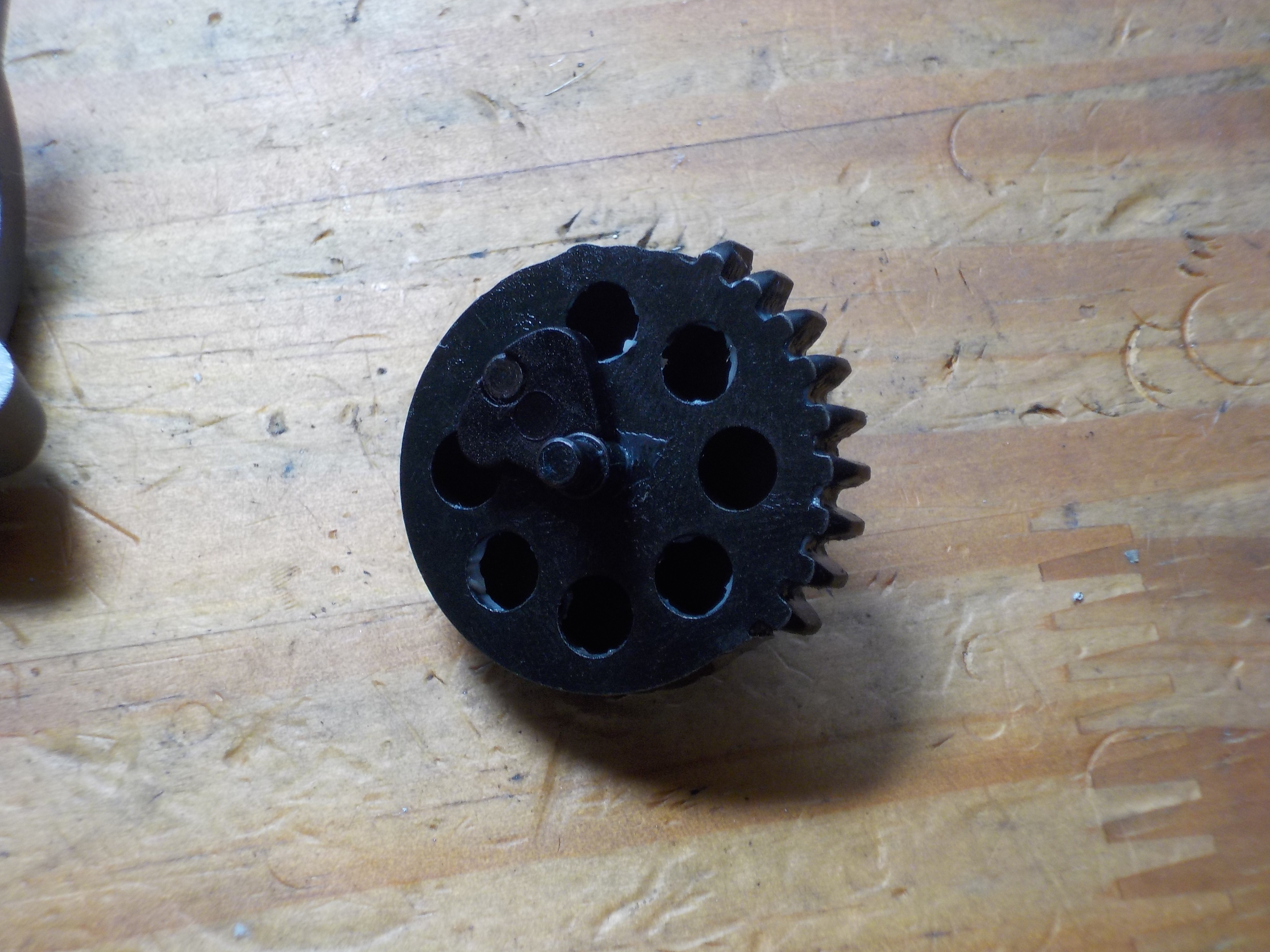 下側のやつは、マイナスドライバーで、少しねじってやると、反対側のギアが抜けます。