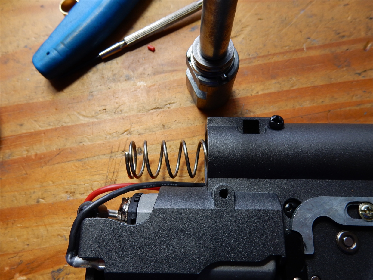 ピンを抜くと、簡単にスプリングが取り出せます。これは良いですね。メカボックスを組み込んでいる状態でも取り替えできますね。