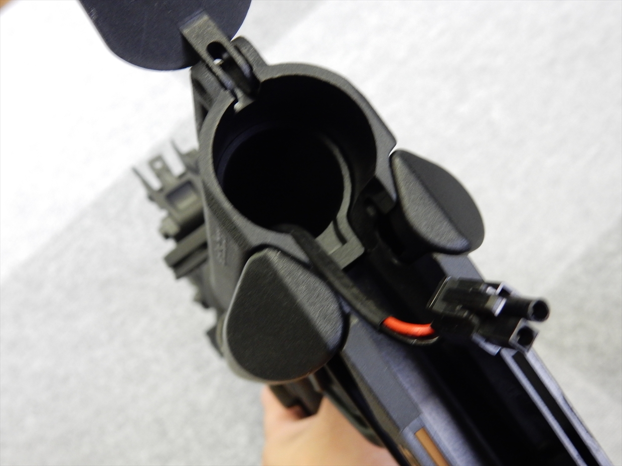 チャージングハンドルを引くと、ボルトカバーが後退して、この位置で停止します。ホップの調整がしやすい。