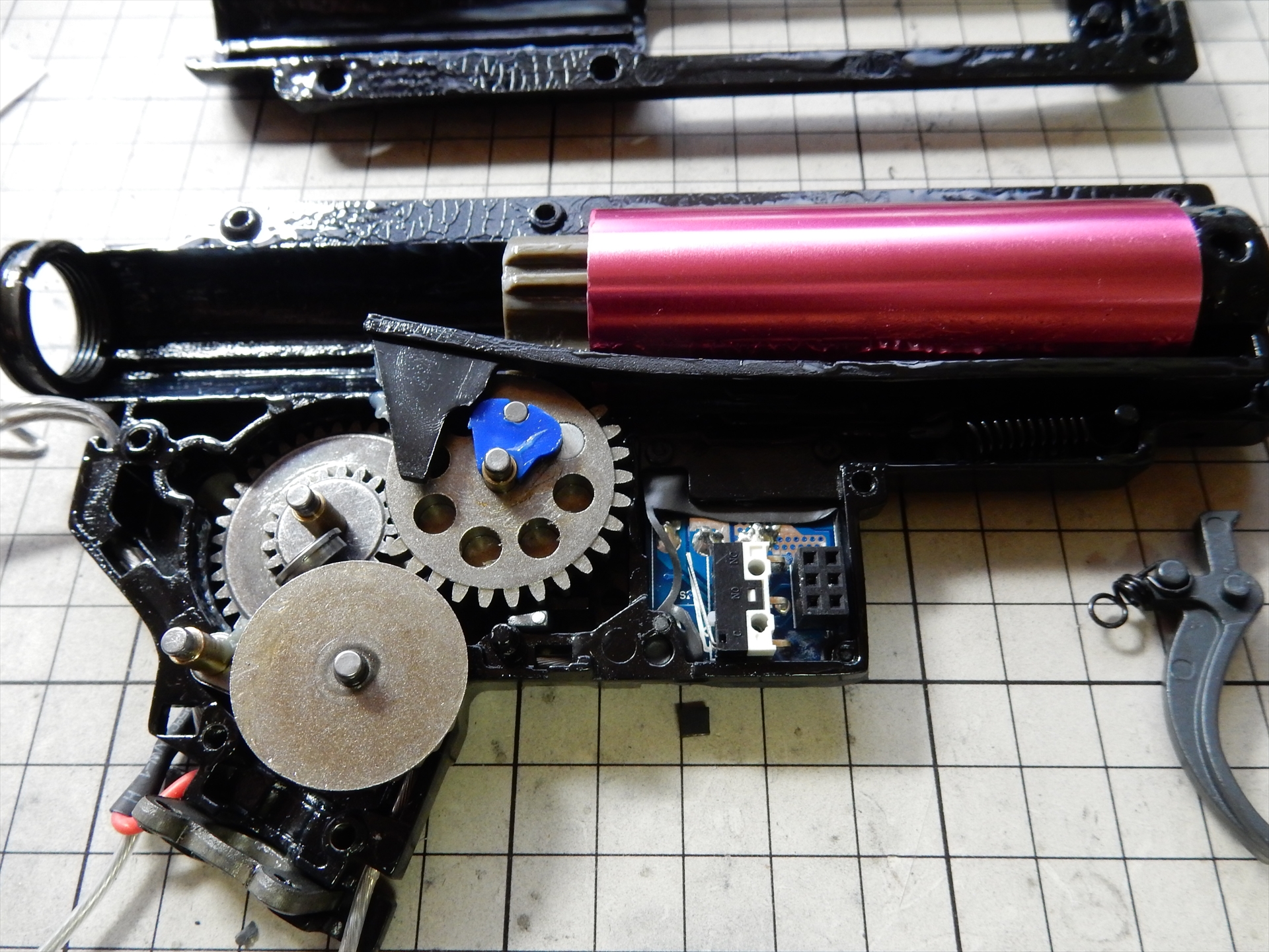 このメカボはよく考えており、スプリングを後方より出し入れ出来るのは、最近スタンダードになりつつあるのですが、M4系はボディの構造上ストックチューブが邪魔して、アクセス出来ないのが多いのですが、ARESはストックを外したらそのままアクセスできます。また、後方配線がモーターのピニオンと絡まないように外から回すように工夫されています。