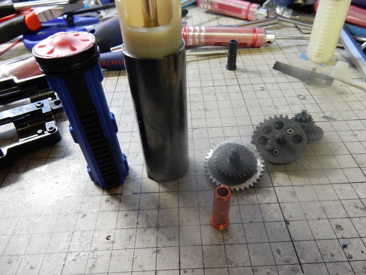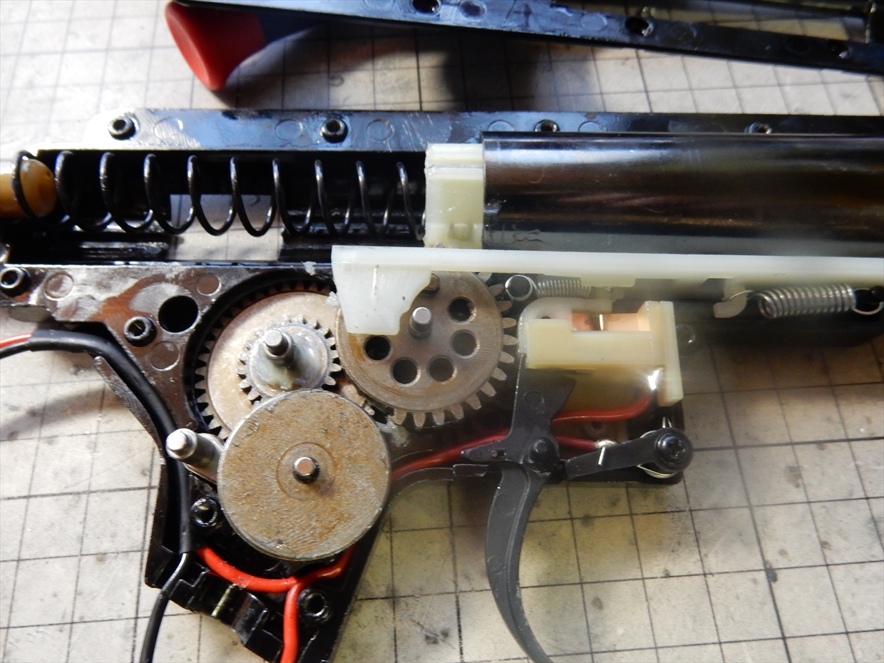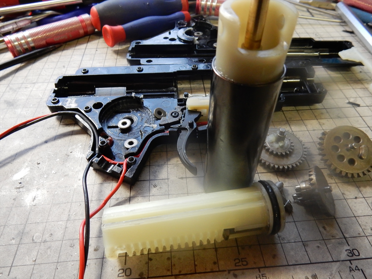 シリンダーとピストンは、ロングタイプではなく、専用のシリンダーヘッドを利用して、普通の電動ガン用の部品を利用できるようにしています。