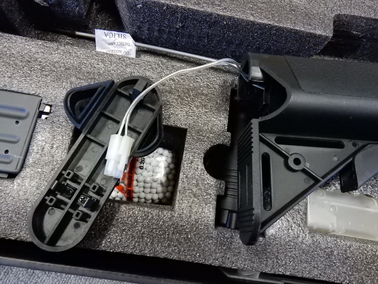 本体+マガジン+フォアグリップ+BBローター+レイルカバー+BB弾+クリーニングロッドが入っています。