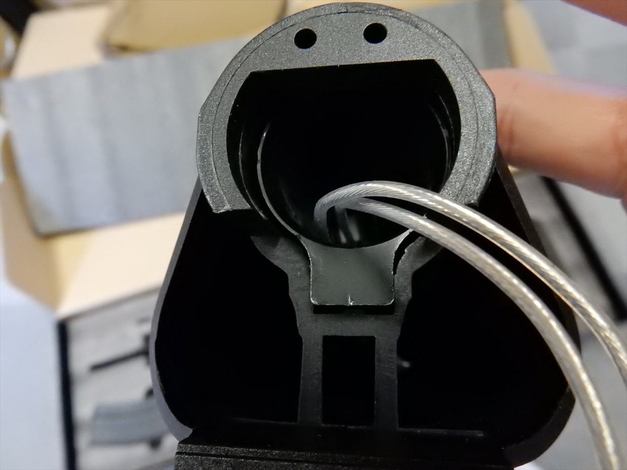 フロントサイト下部に、スリングベイが着いています。反対側にはフラッシュライトをつけれそうなくぼみがありますが・・・