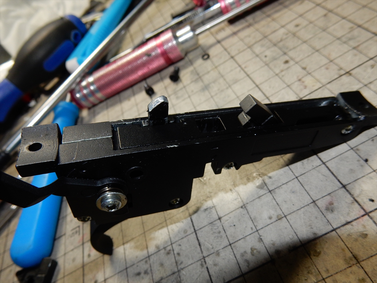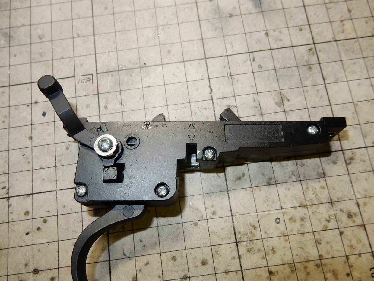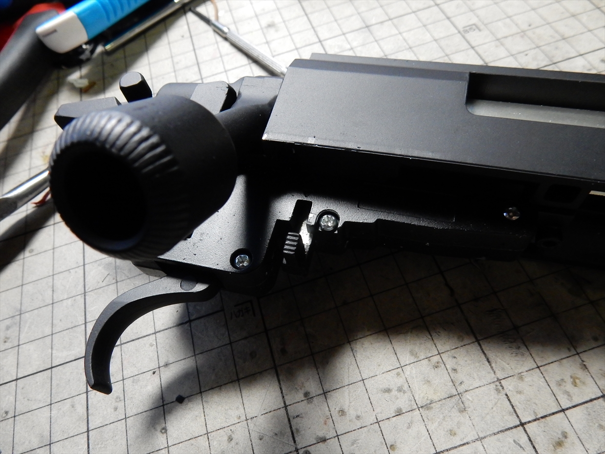 意外にもトリガーの引きしろを調整する機構が着いていましたので、調整します。