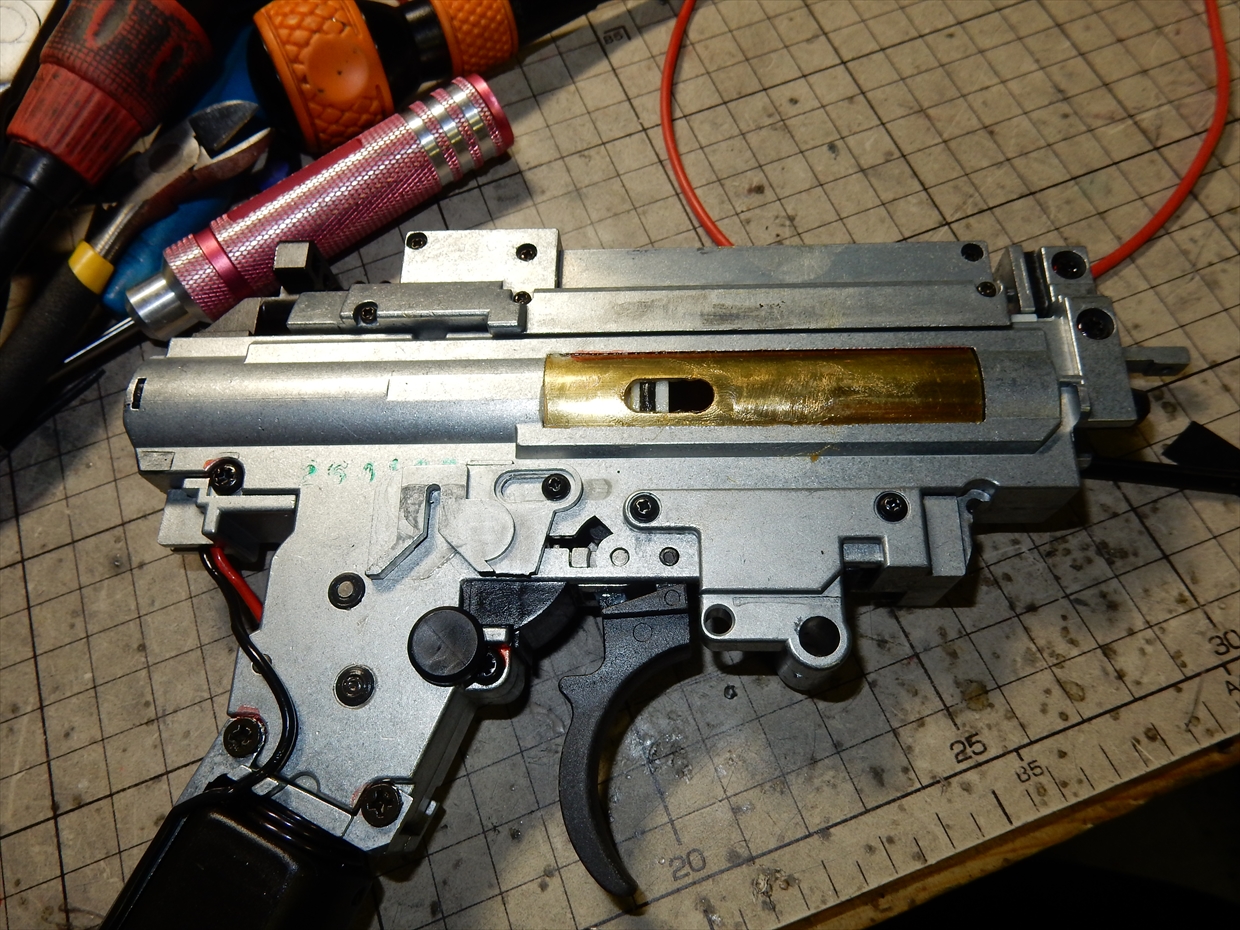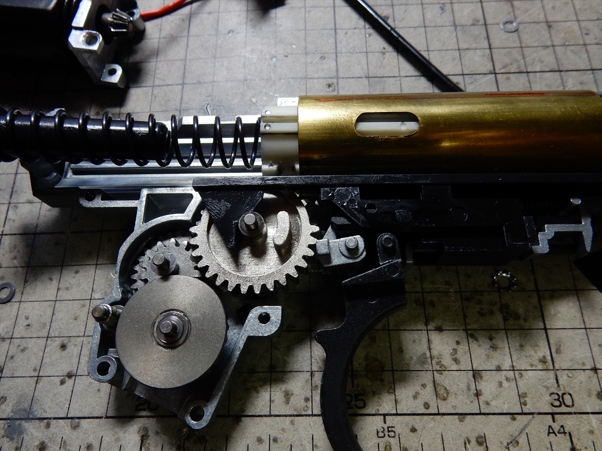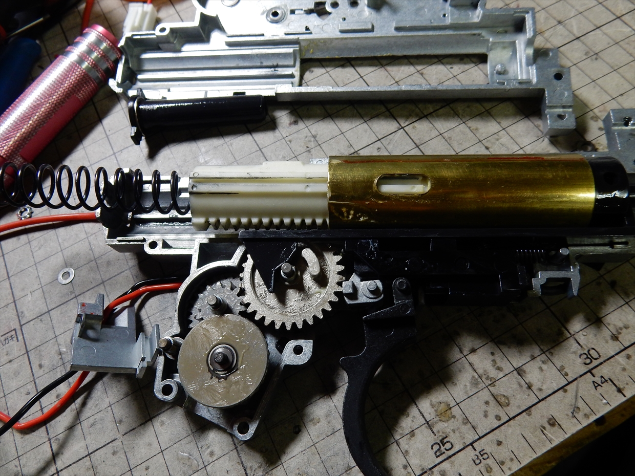 今回は、パーツ交換は特には行わず、気密再調整・シム再調整・ピストンレール研磨・スプリングガイドに足を足して初速調整をしていきます。