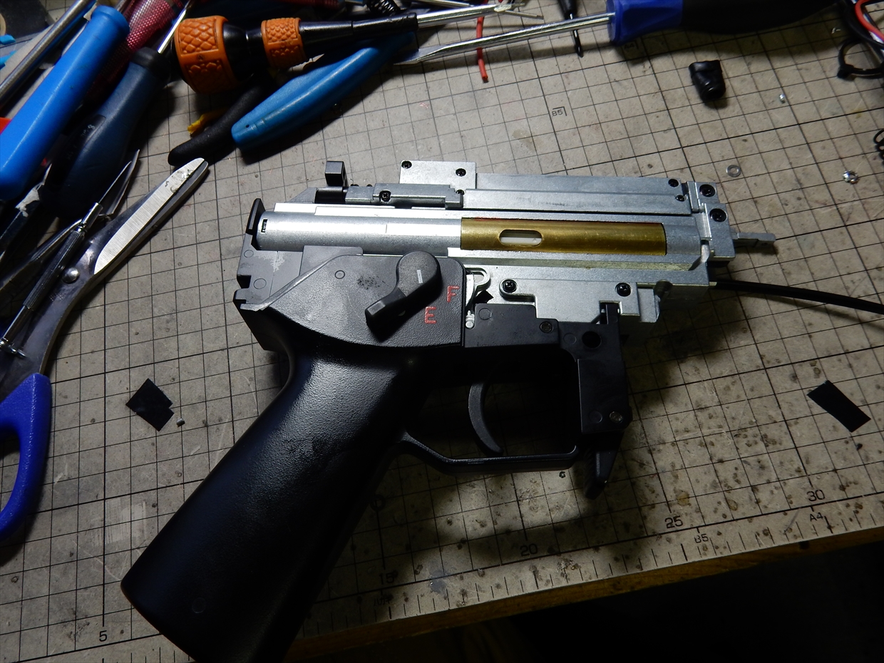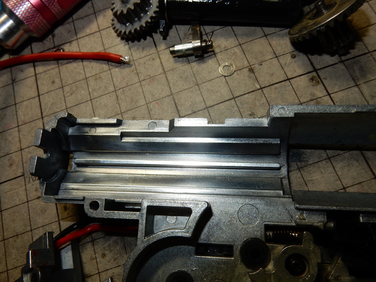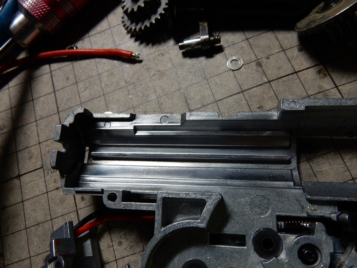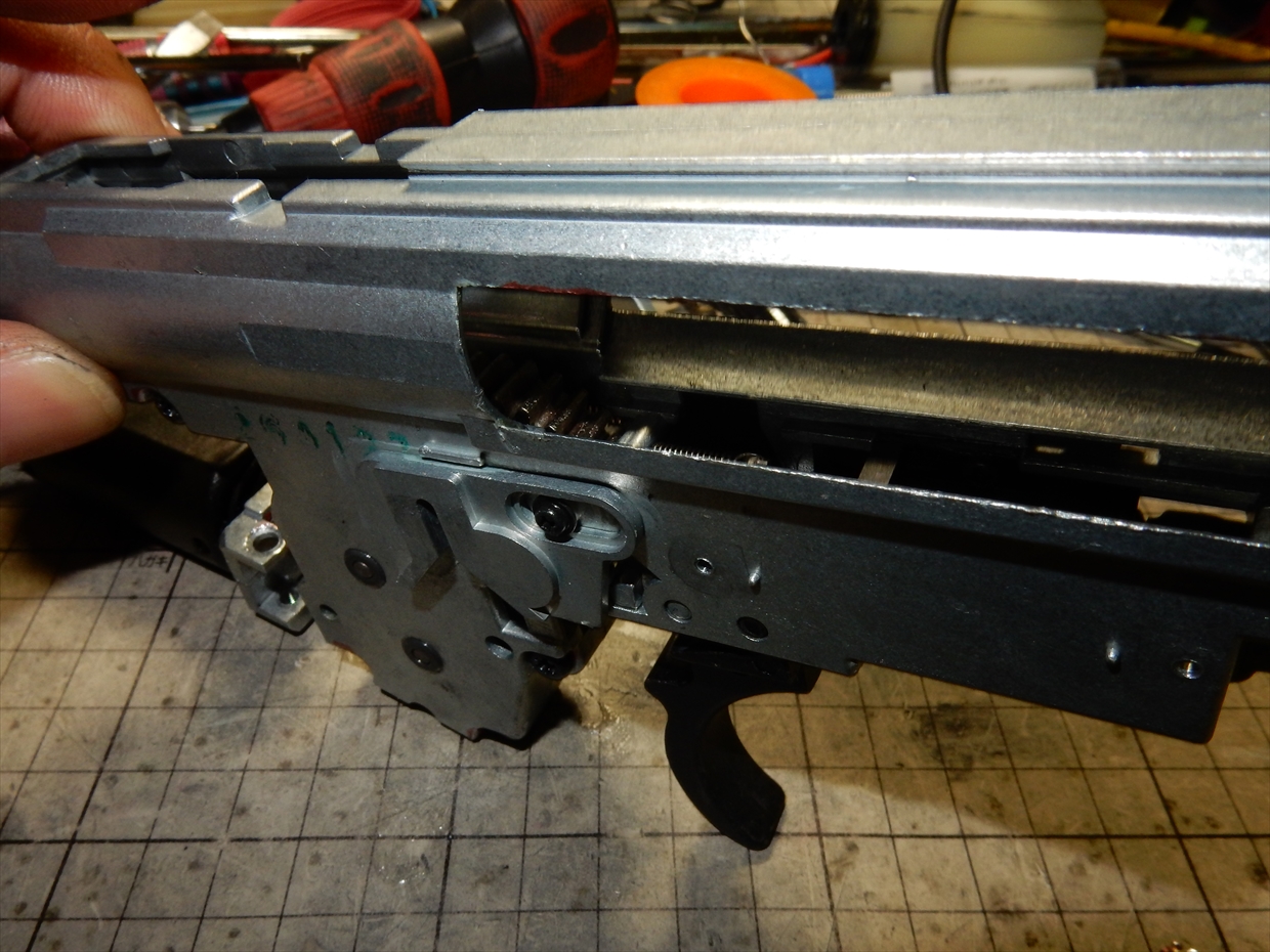 今回は、パーツ交換は特には行わず、気密再調整・シム再調整・ピストンレール研磨・スプリングガイドに足を足して初速調整をしていきます。
