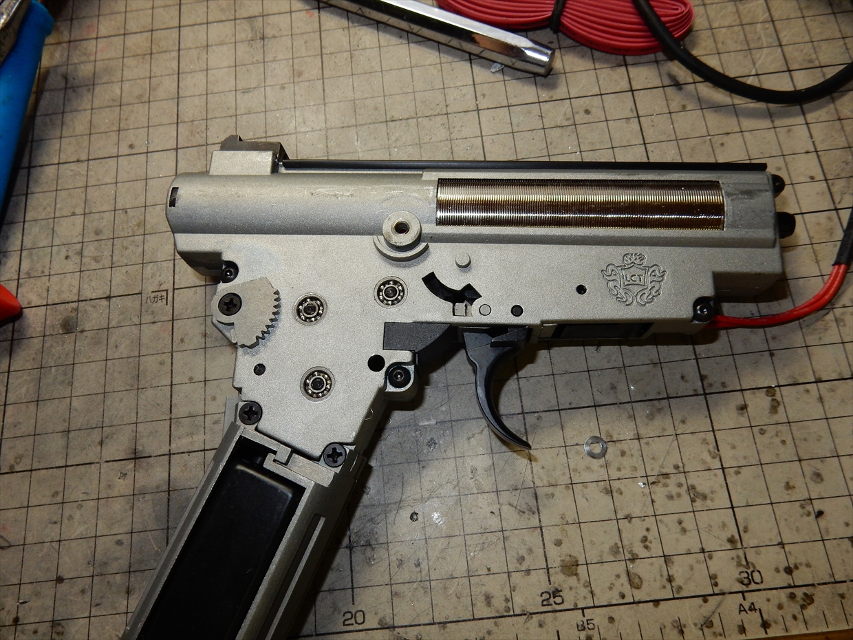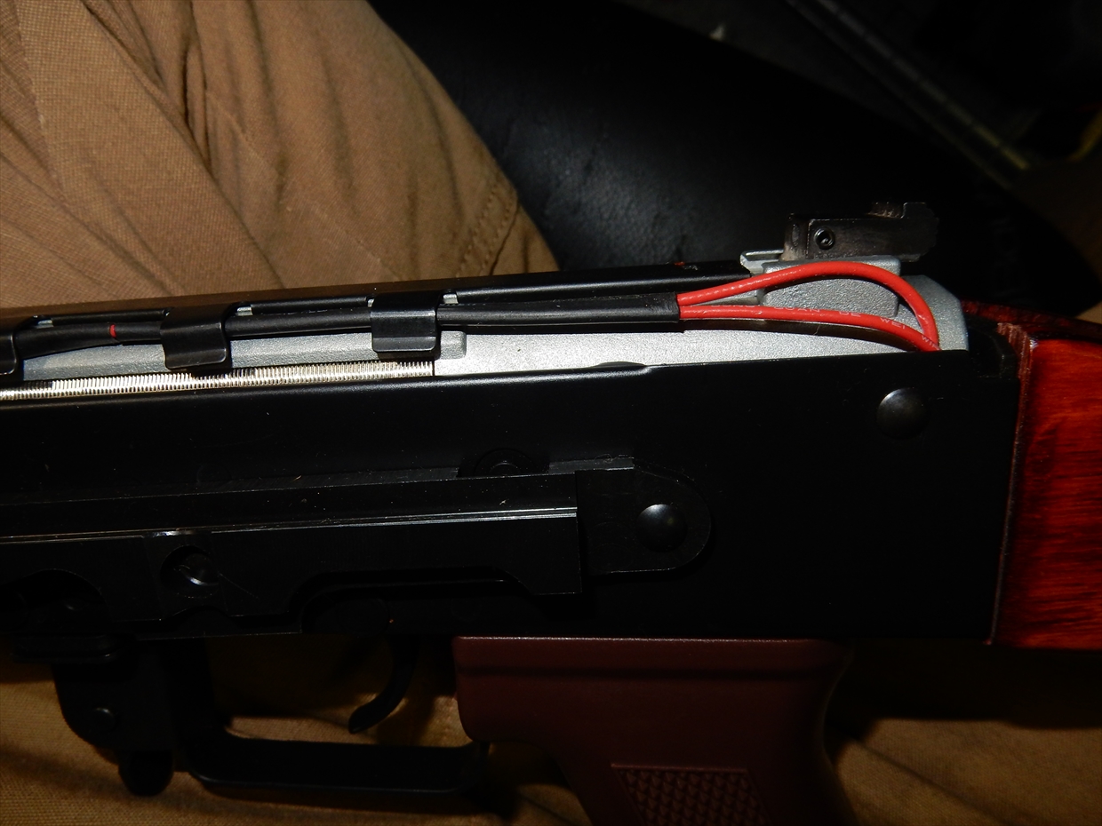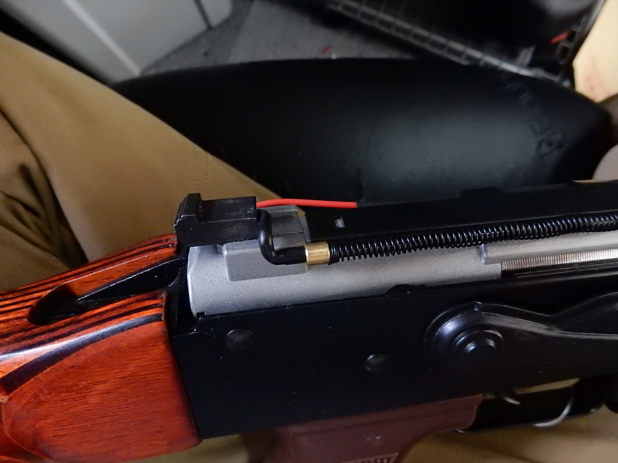 LCTは、AKのこの部分の分解方法が違っており、イモネジで、チャージングハンドルロッドが固定されていますので、イモネジを緩めて、ロッドを外すようにします。