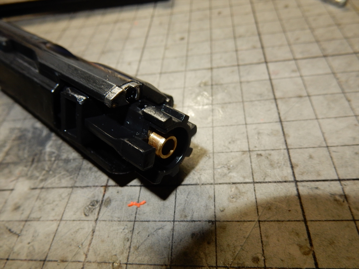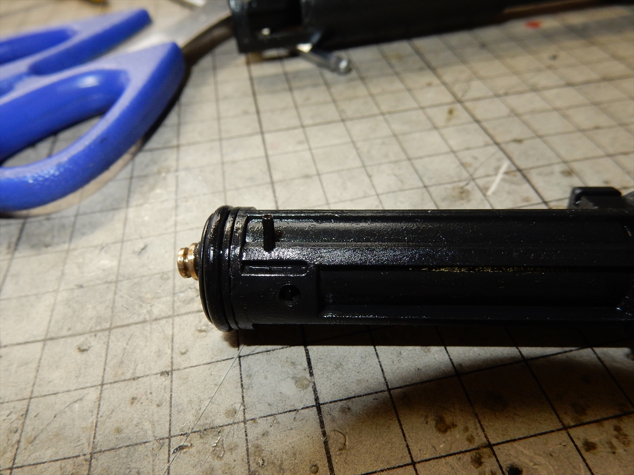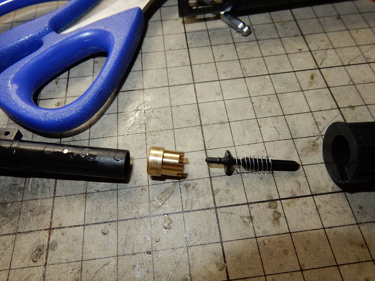 私の場合、ローディングノズルの分解写真の真鍮パーツの右側をほんの少し削りました。こうすれば、切替バルブ位置が左に移動してノズル側のガス量が増えます。ただし、一旦削れば戻りませんので少しずつ削って弾速計で測り、を繰り返し余裕を見て室温27℃下で80m/sec前半に調整しました。それをしない場合、今の季節ならG&G製120%ハンマースプリング組込みも選択肢としては有効かと思います。あとお勧めはVFC製ハイスピードリコイルバッファーを組んでサイクルアップすれば、セミのキレが良くなります。
