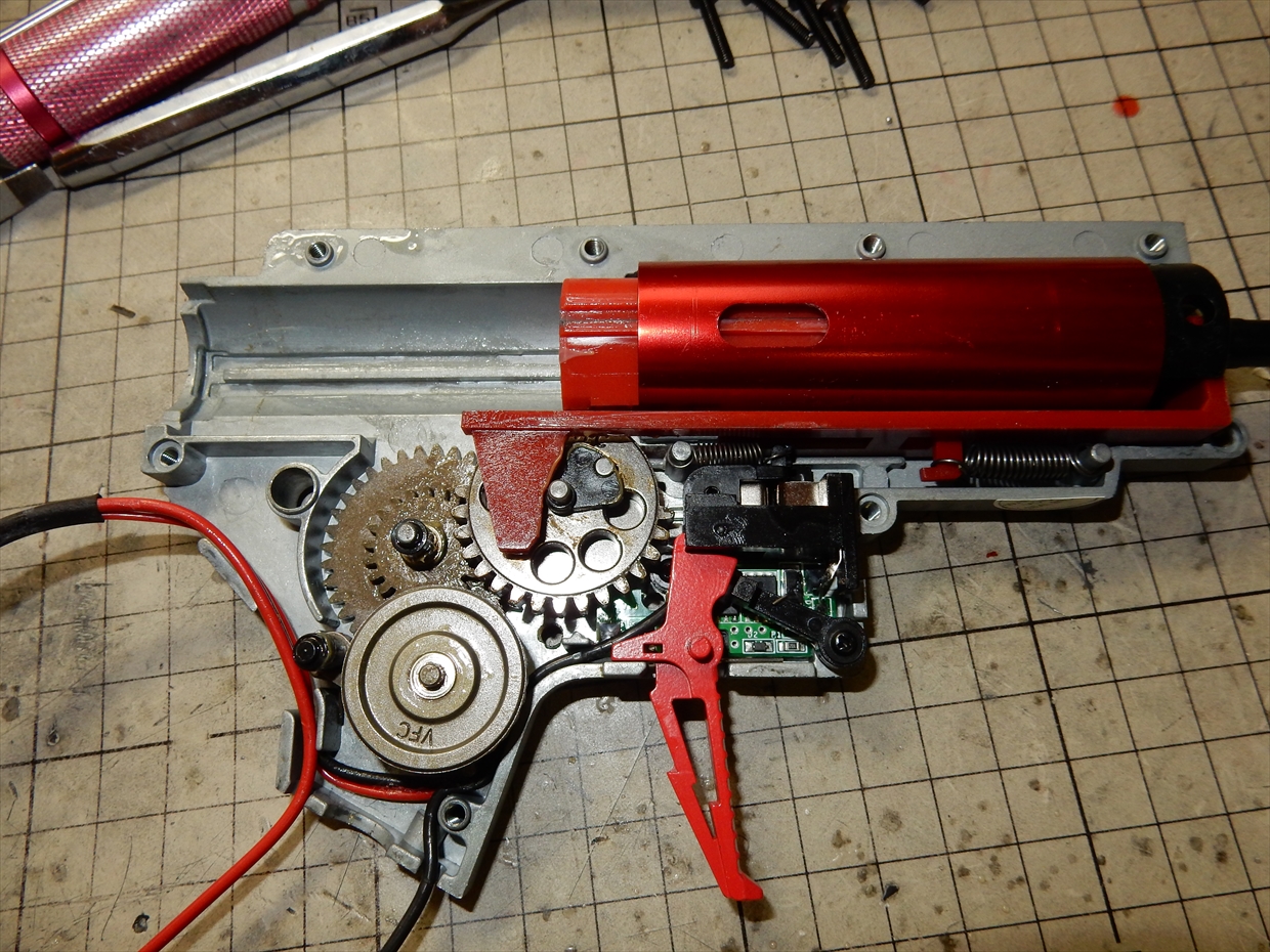グリスは割と綺麗に塗られており、アルミシリンダーと、ストレートトリガーが目立ちますね。