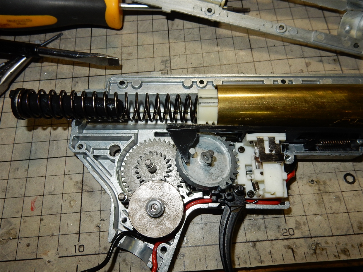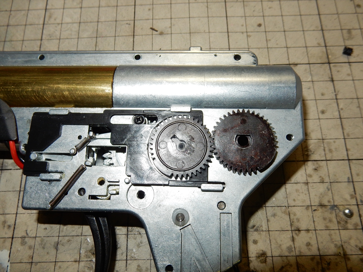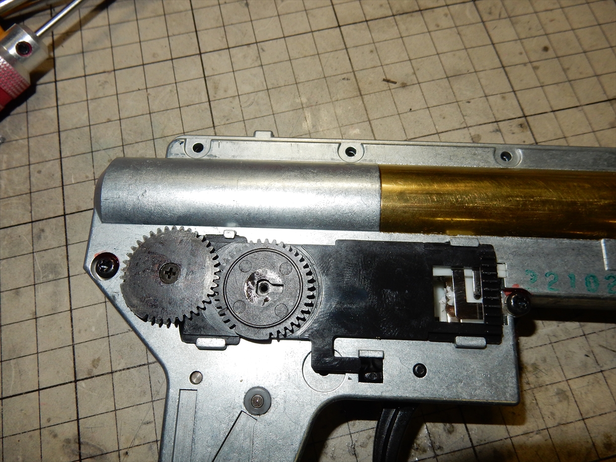 まあマルイらしい、貧弱なギアと薄いグリスが見えます。