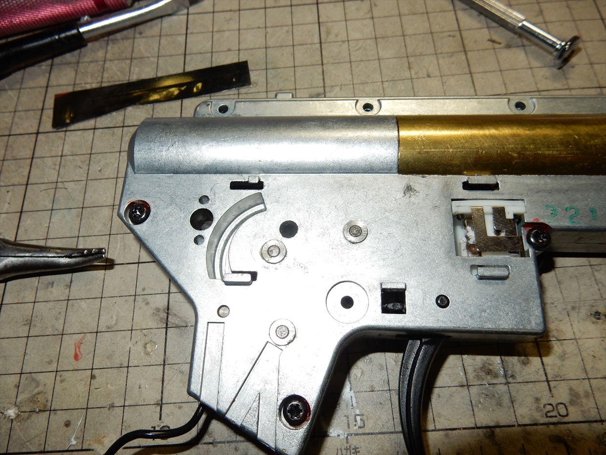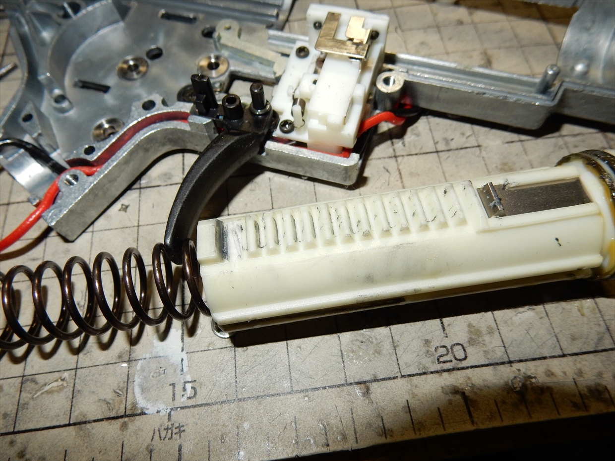 バーストをよく使うと、バーストとセミが使えなくなる現象が起きるのですが、その場合、メカボ内のパーツが折れているか、この写真にあるスプリングが外れている場合があります。