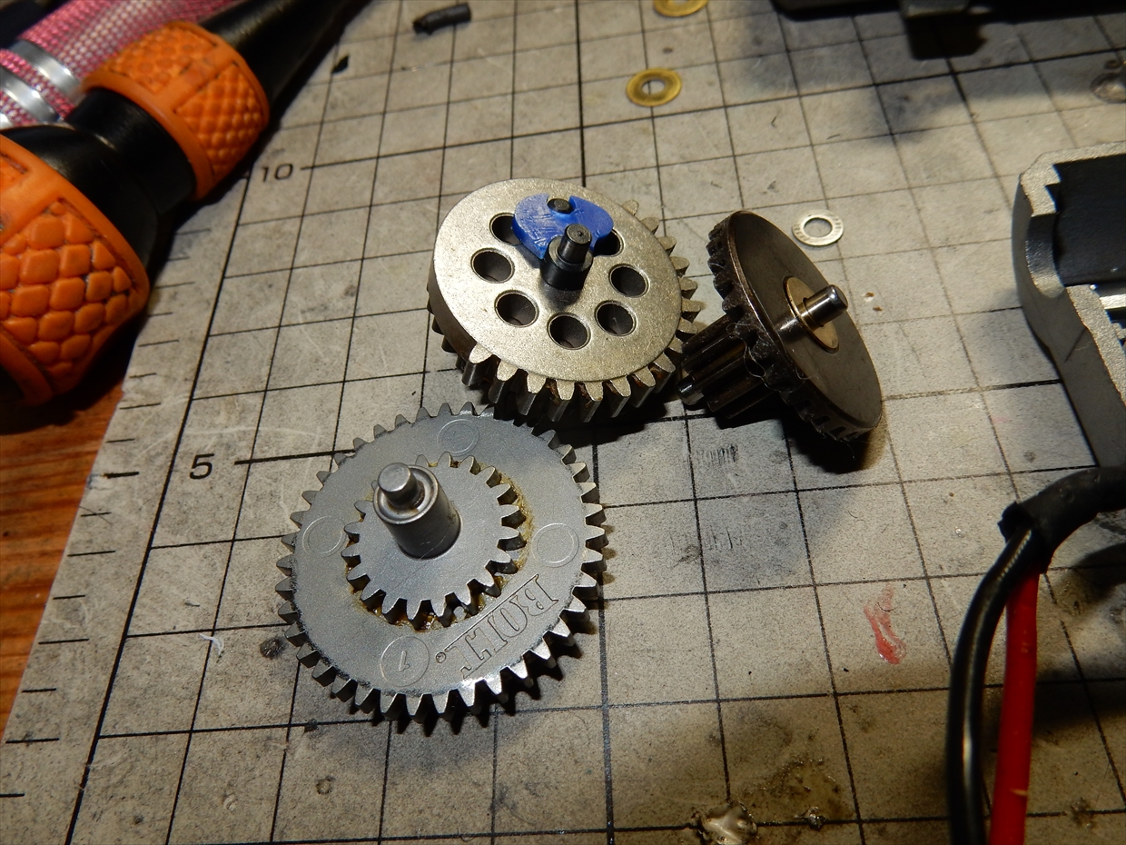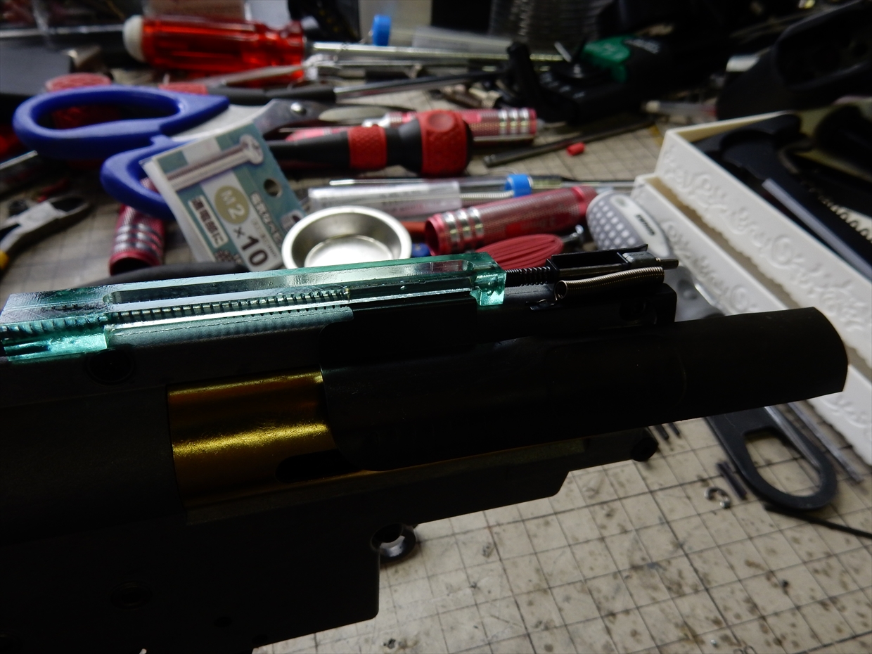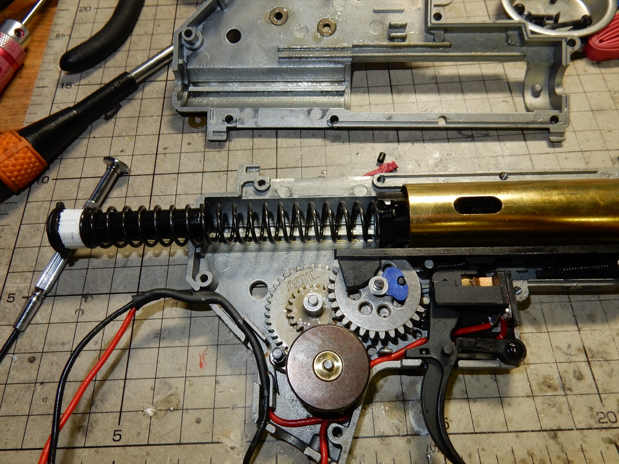 リアルショックなので、セクターギアを落とせないので、ピストンの3枚目をカット、4枚目をハーフカットします。