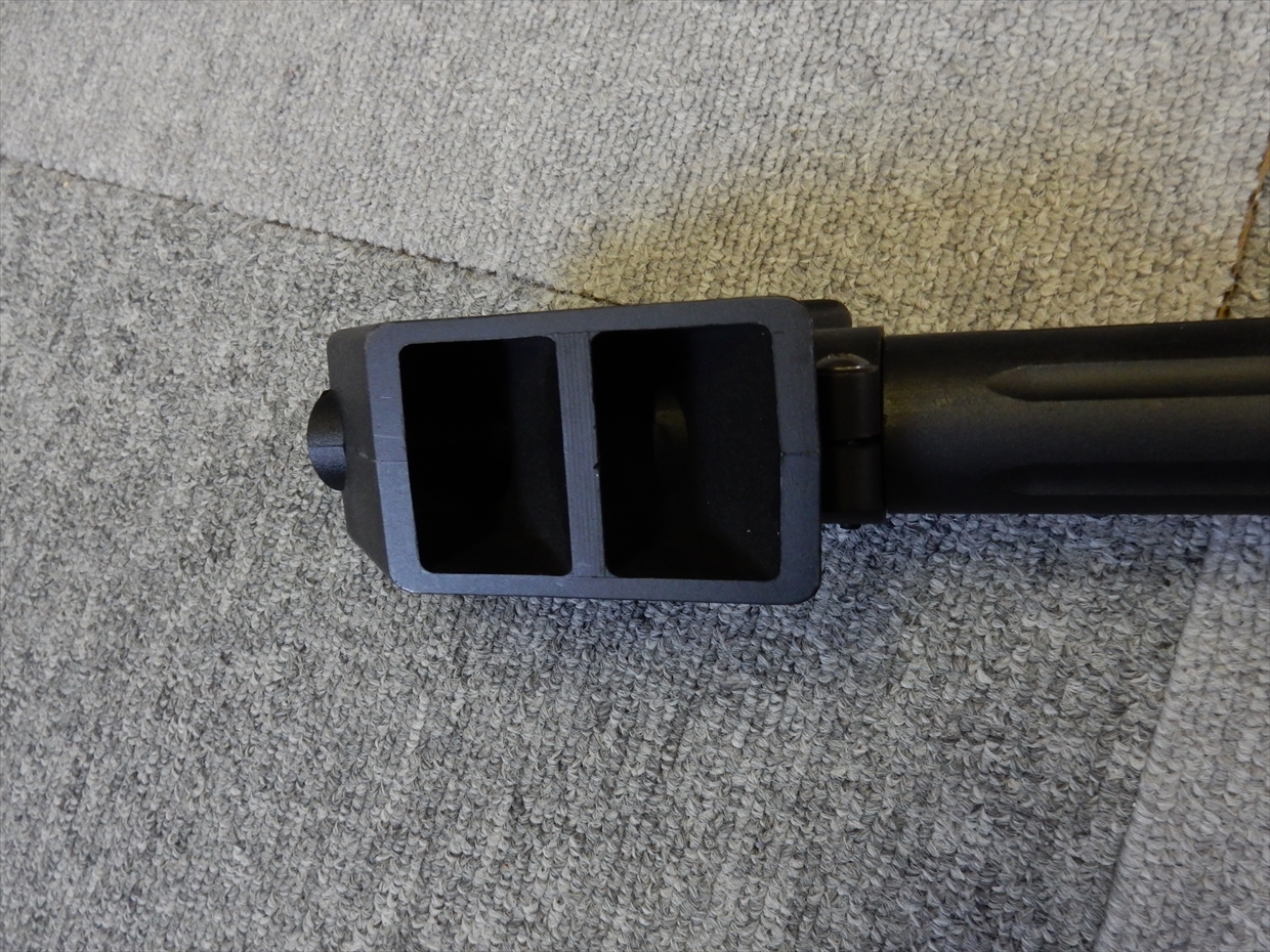 実銃では、この巨大なマズルブレーキで、ガスを左右後方へ排出し、アウターバレル自体で反動をある程度吸収できるので、意外と肩にかかる反動は少ないです。