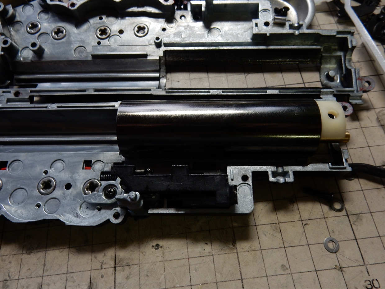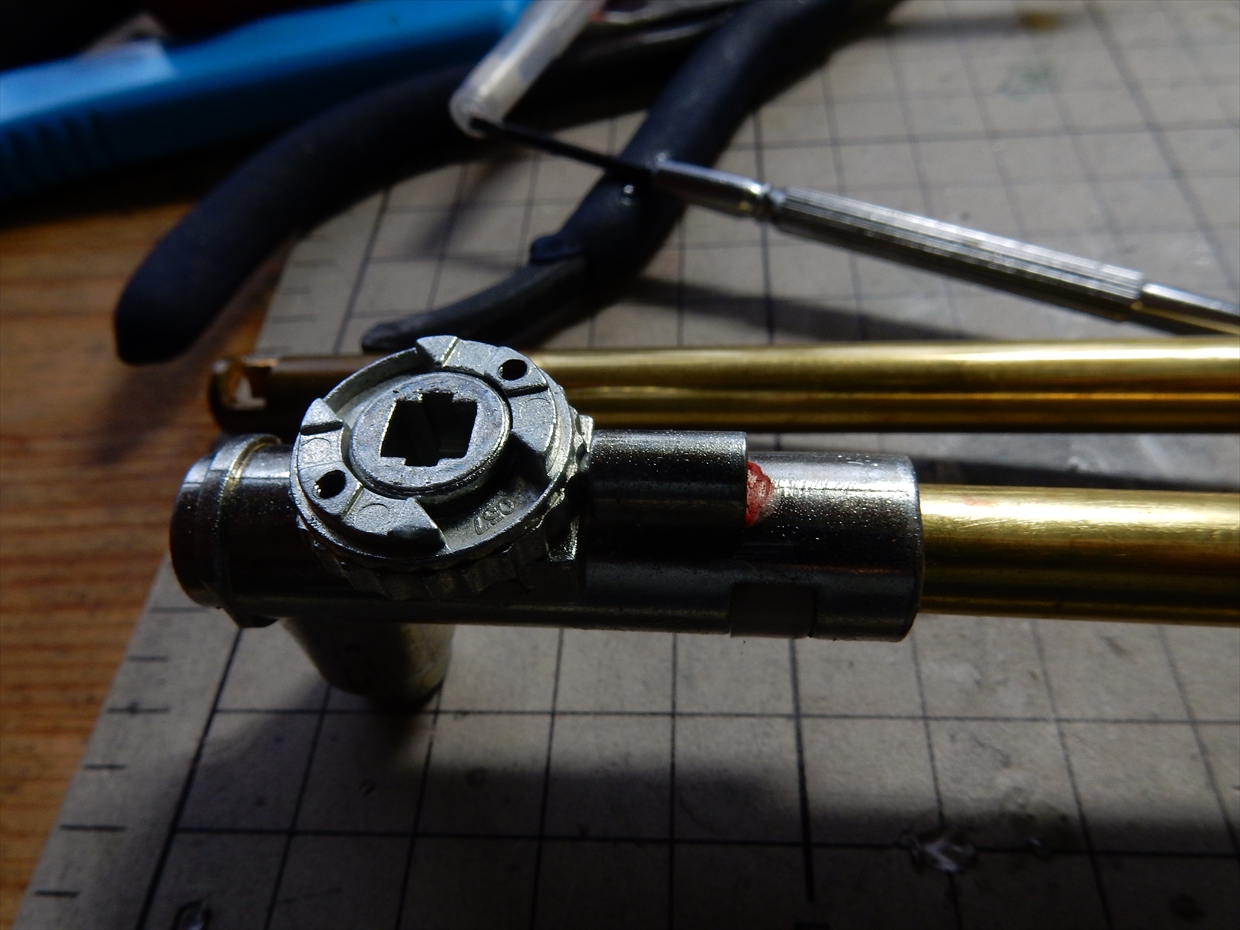 メカボックスの後ろにある穴にピンをいれて押すと、ピストンがリリースされます。