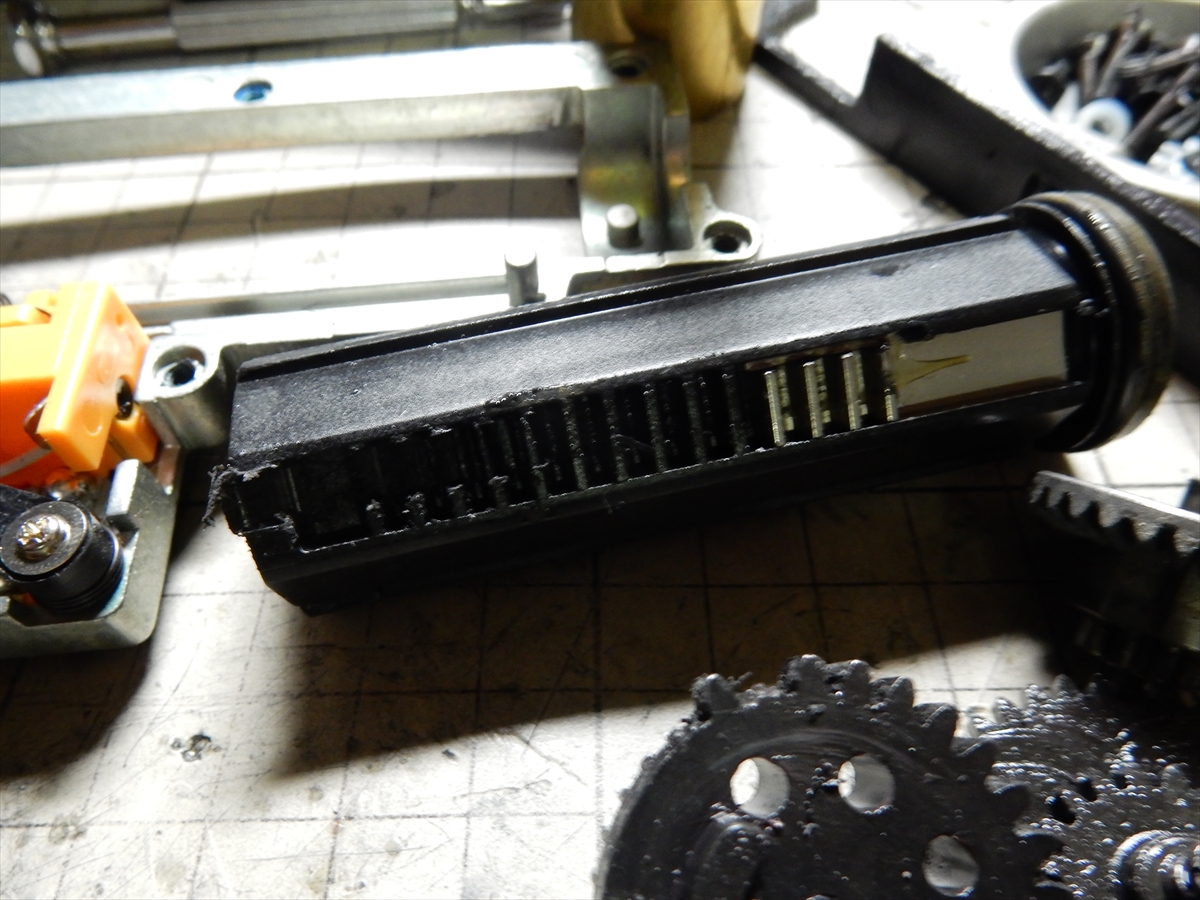 結構粘度の高いグリスで全体がべったりな感じでしたが、ギアの破片を見つける事は出来ませんでした。
