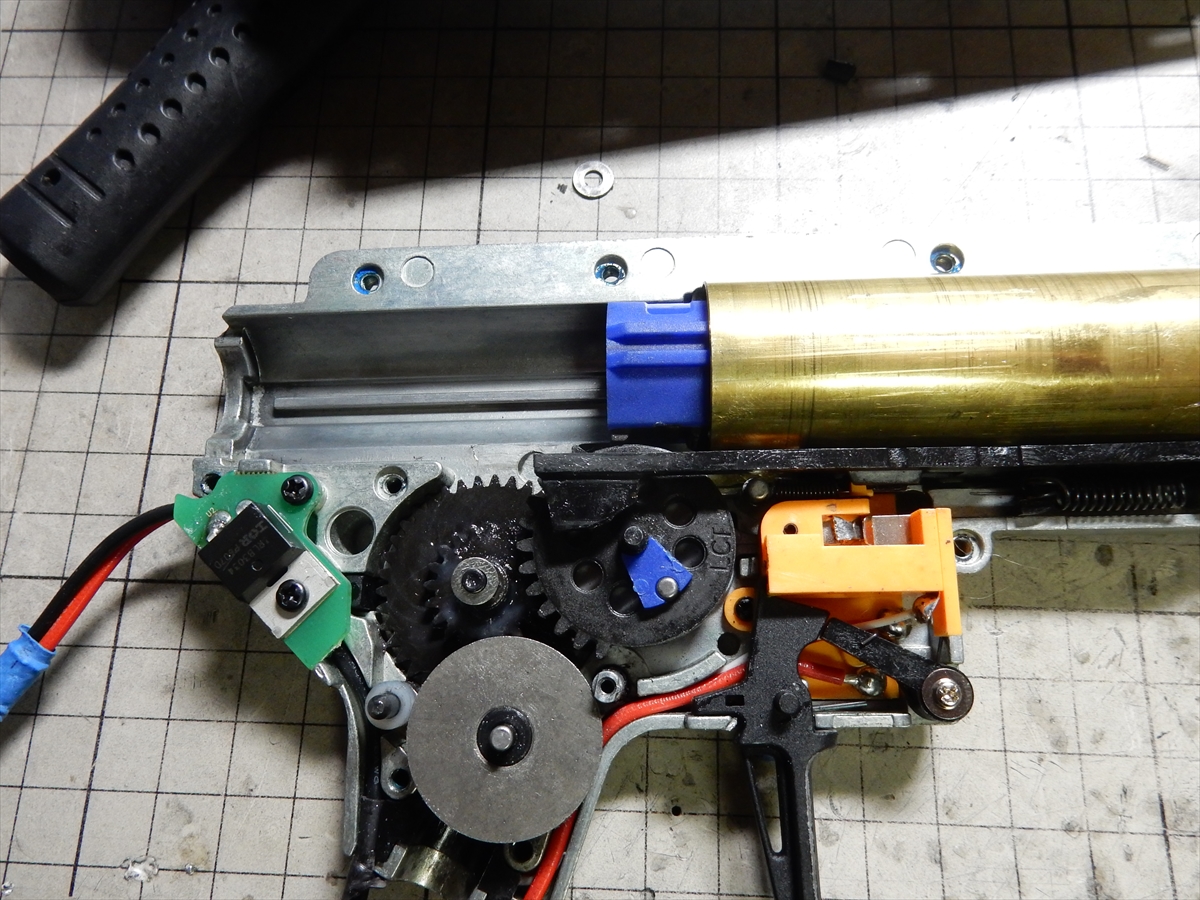 また、この写真のトリガーの接点部分をよく見て頂ければわかるのですが、トリガープルを少なくするために、接点に被せ物をして距離を縮めています。