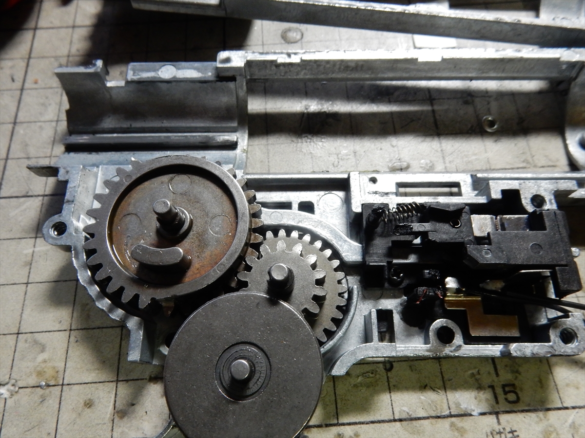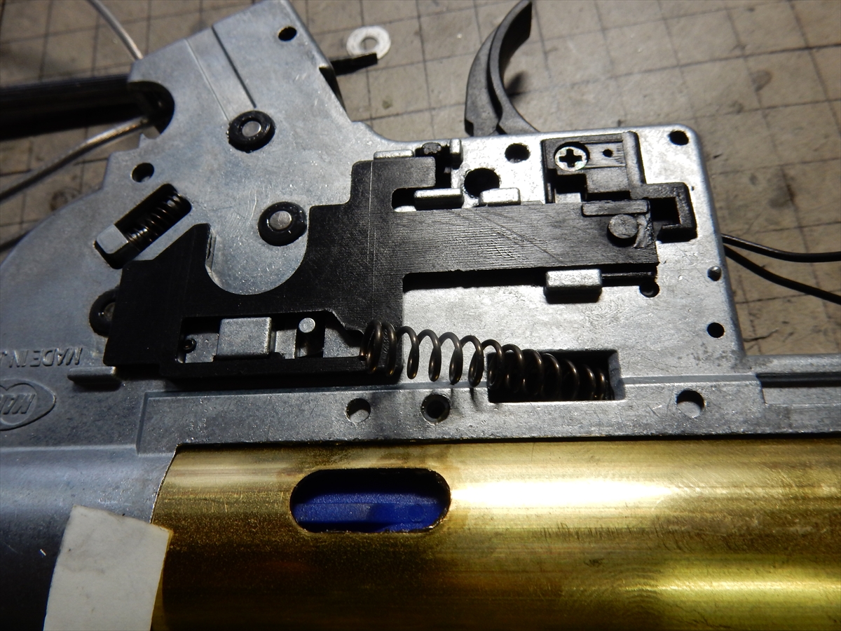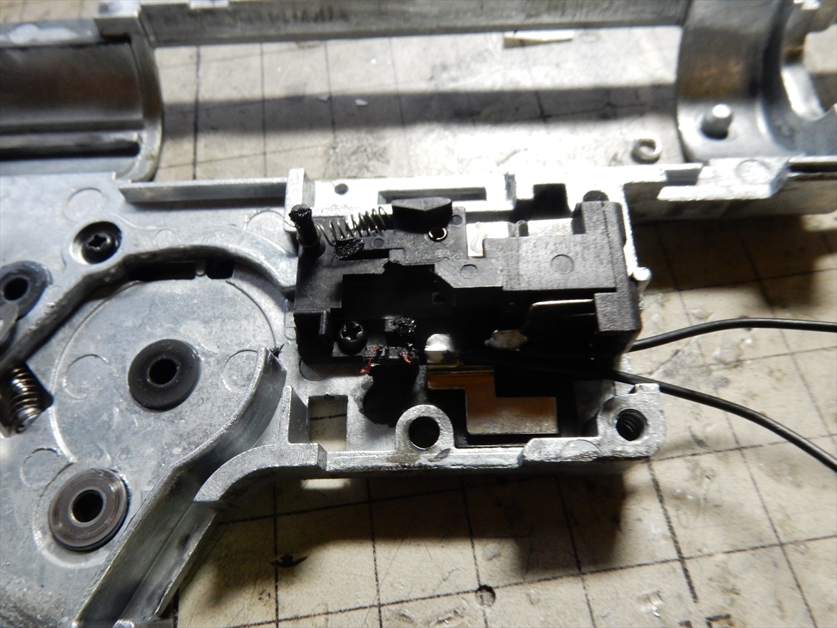 分解していきますが、トリガーの上にあるのは、弾切れ時に通電をカットするシステムですが、いらないので外しても大丈夫です。