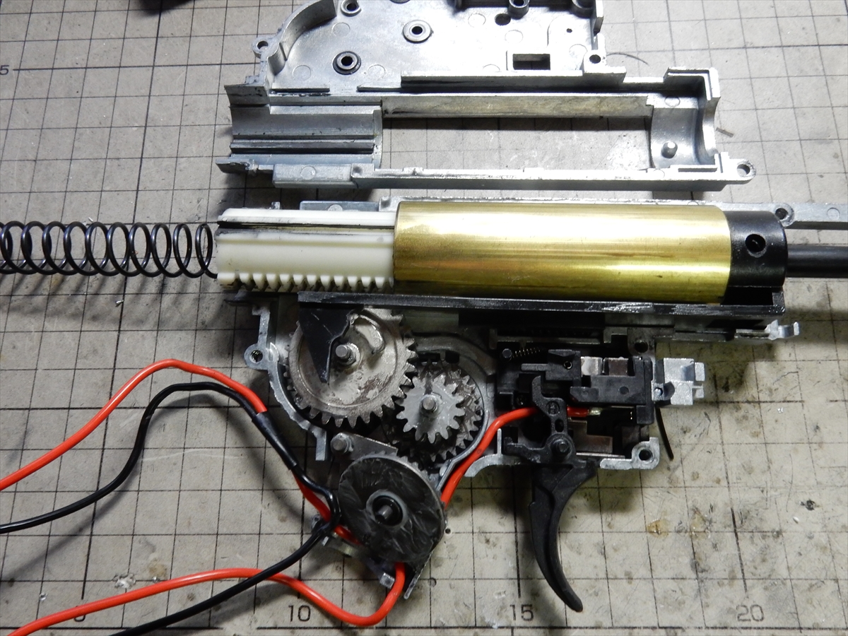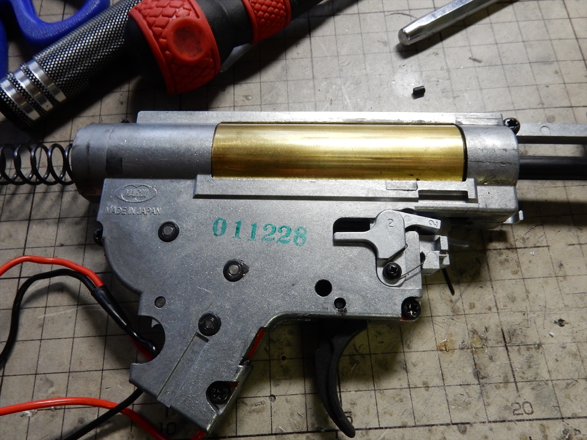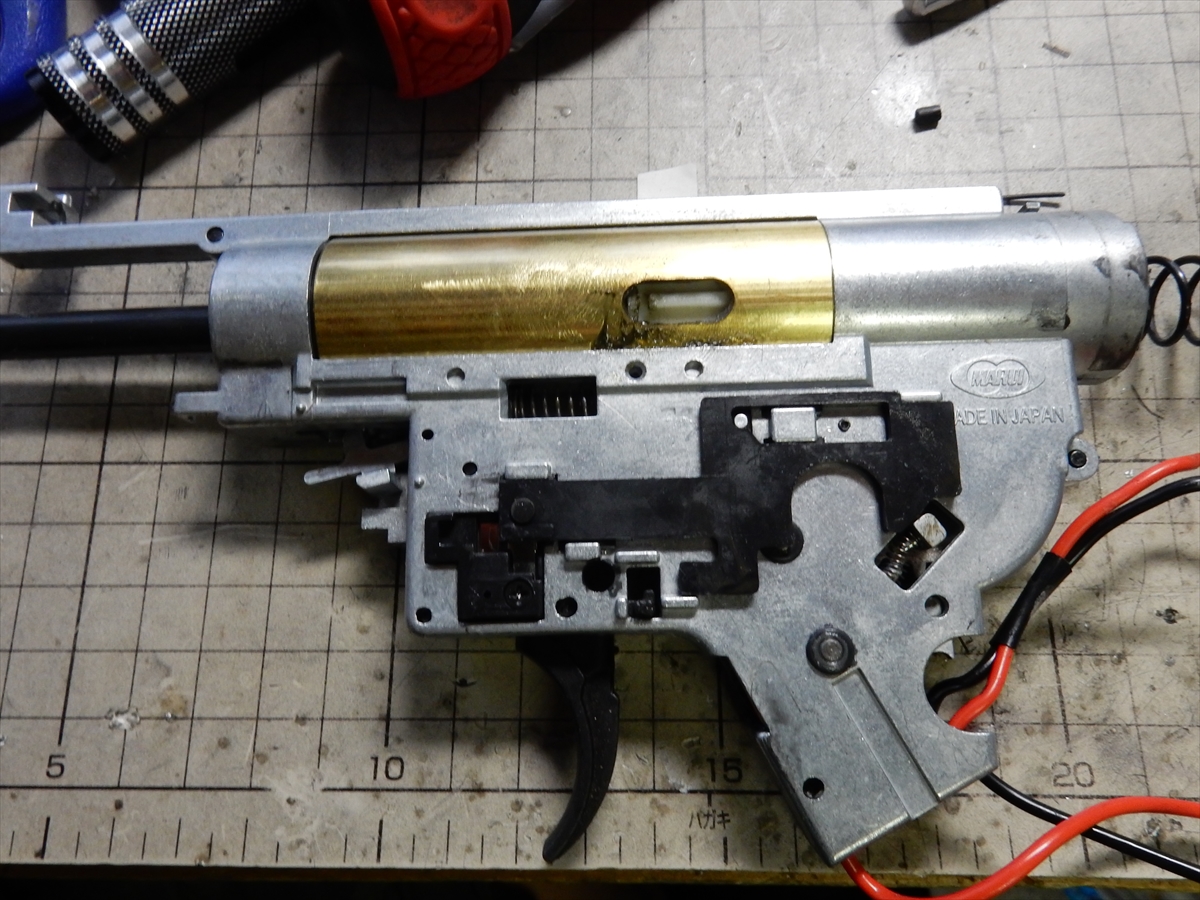 分解していきますが、トリガーの上にあるのは、弾切れ時に通電をカットするシステムですが、いらないので外しても大丈夫です。