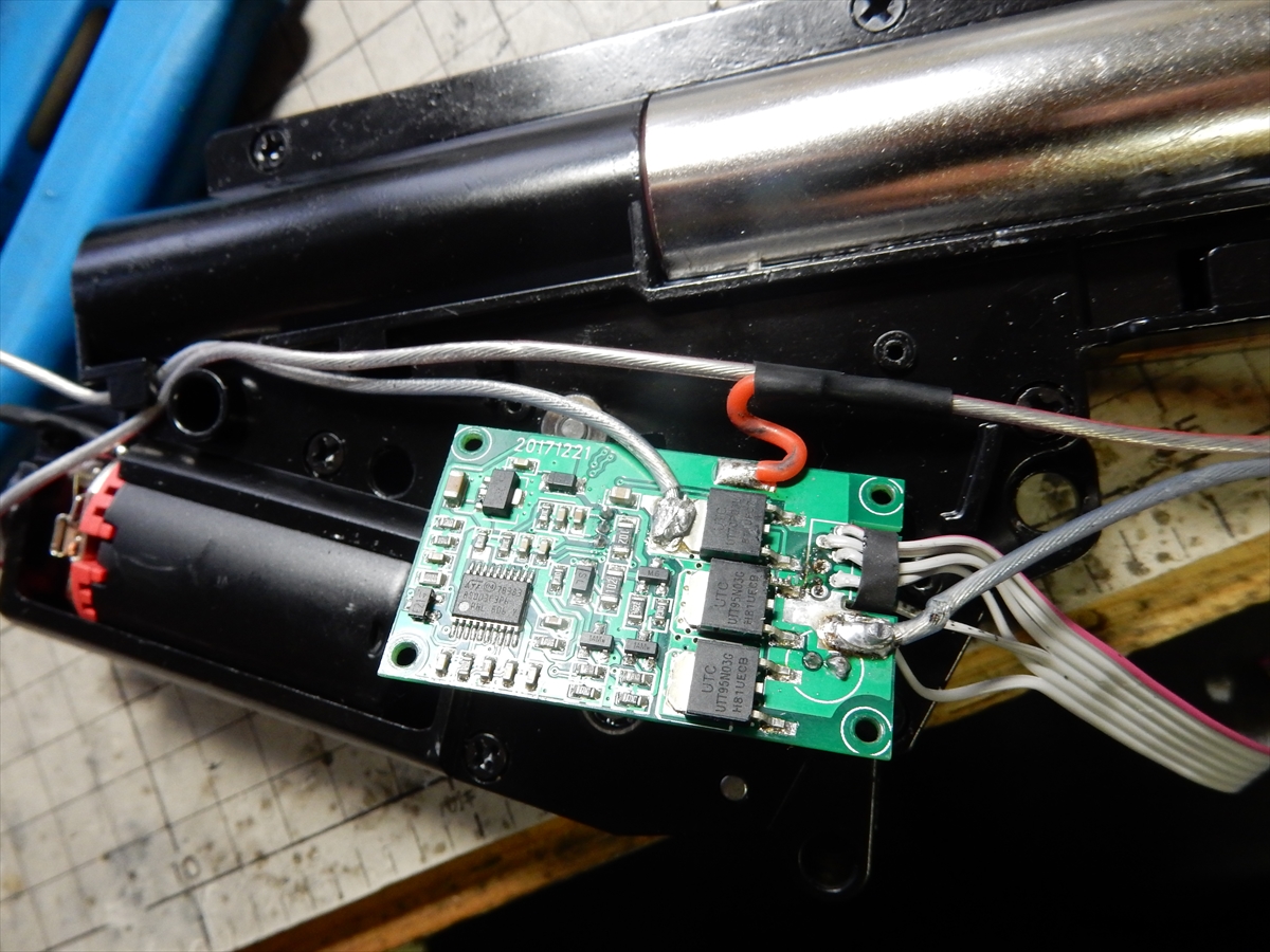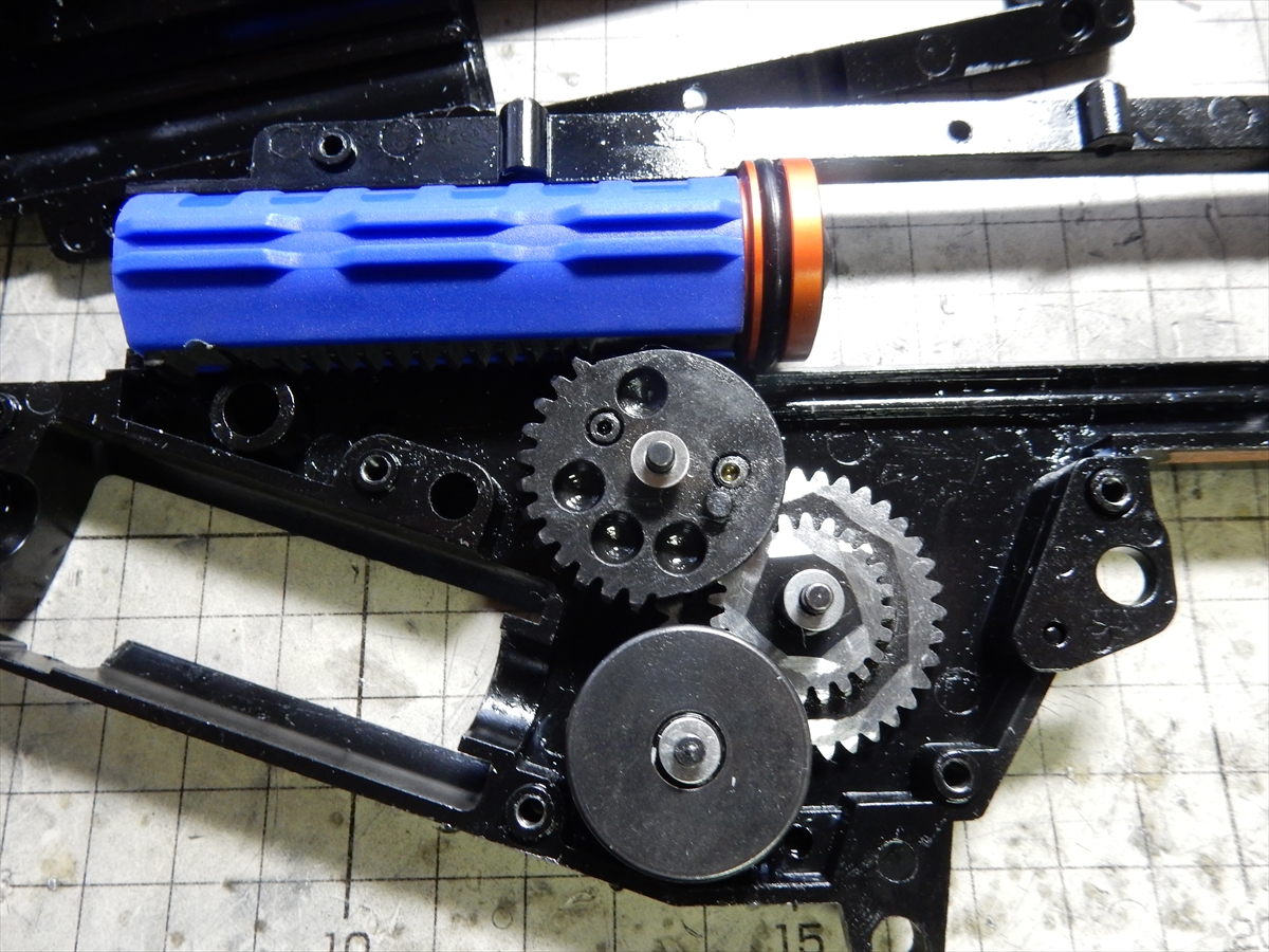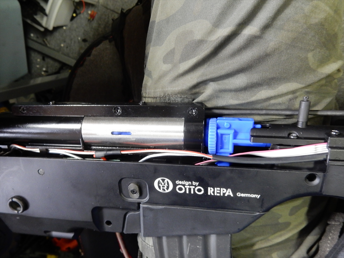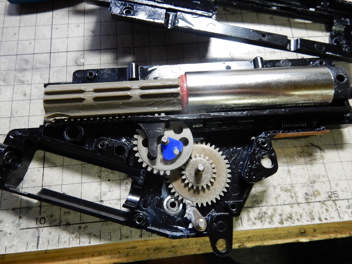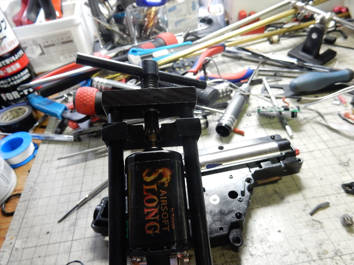 試射の結果・・・加速シリンダーのエア容量不足により初速が上がらない。モーターのピニオンがデカくて少し違和感ある。。。