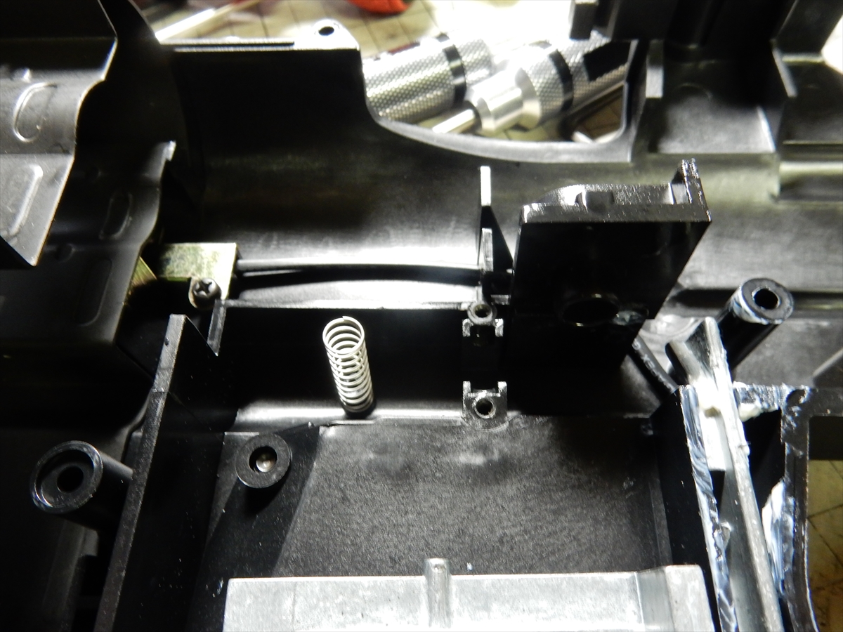 そこのスプリングはおさえてある金属パーツのほうに止めが無いので、マグチェンジしてるだけでスプリングがずれてはずれますよ。