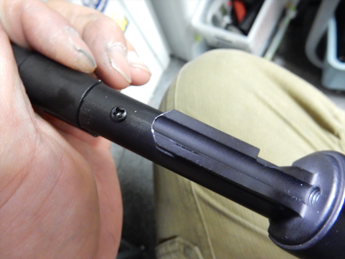 まず、クリーニングロッドを外して、フロントサイトの下にあるネジを外します。
