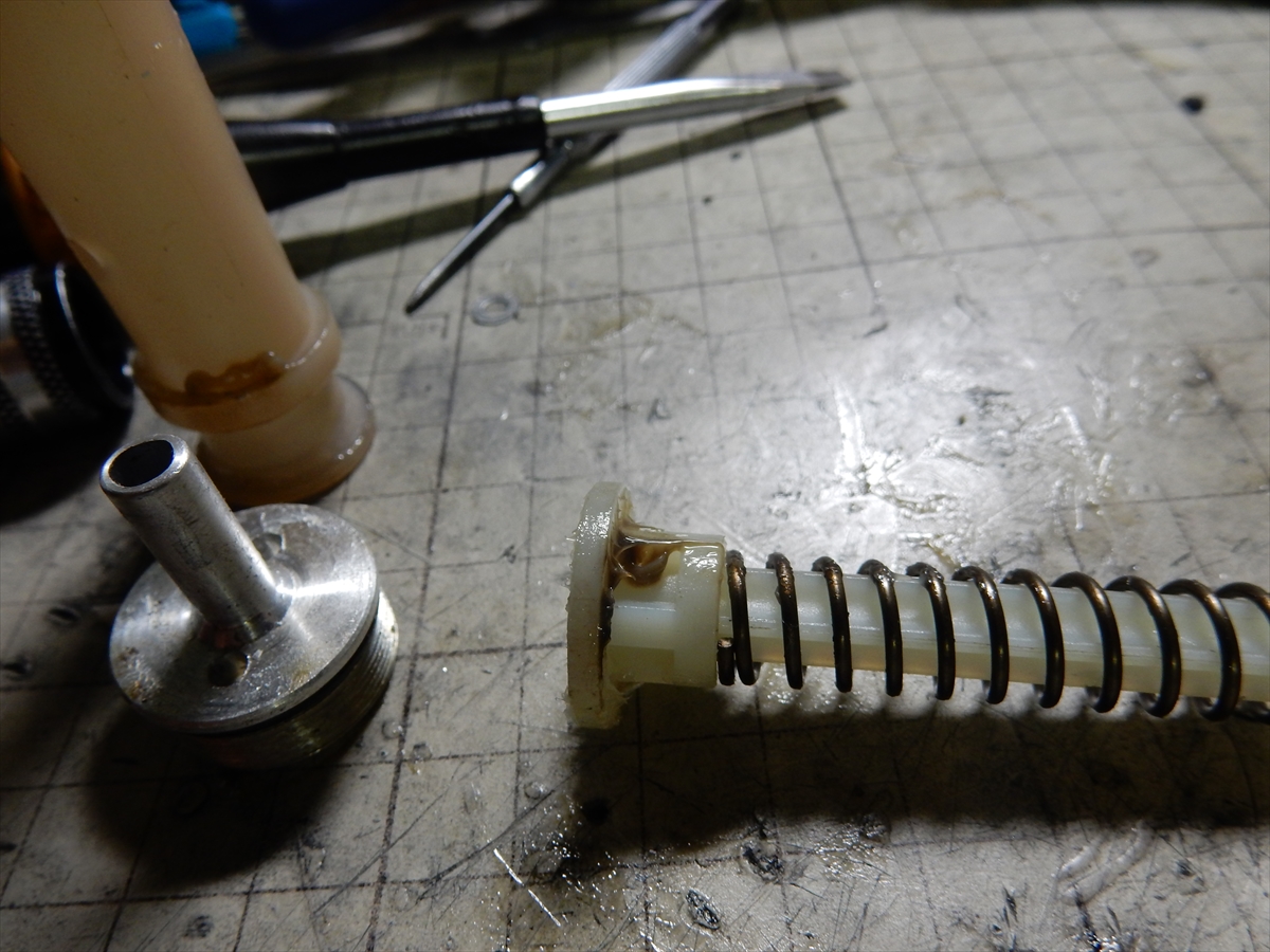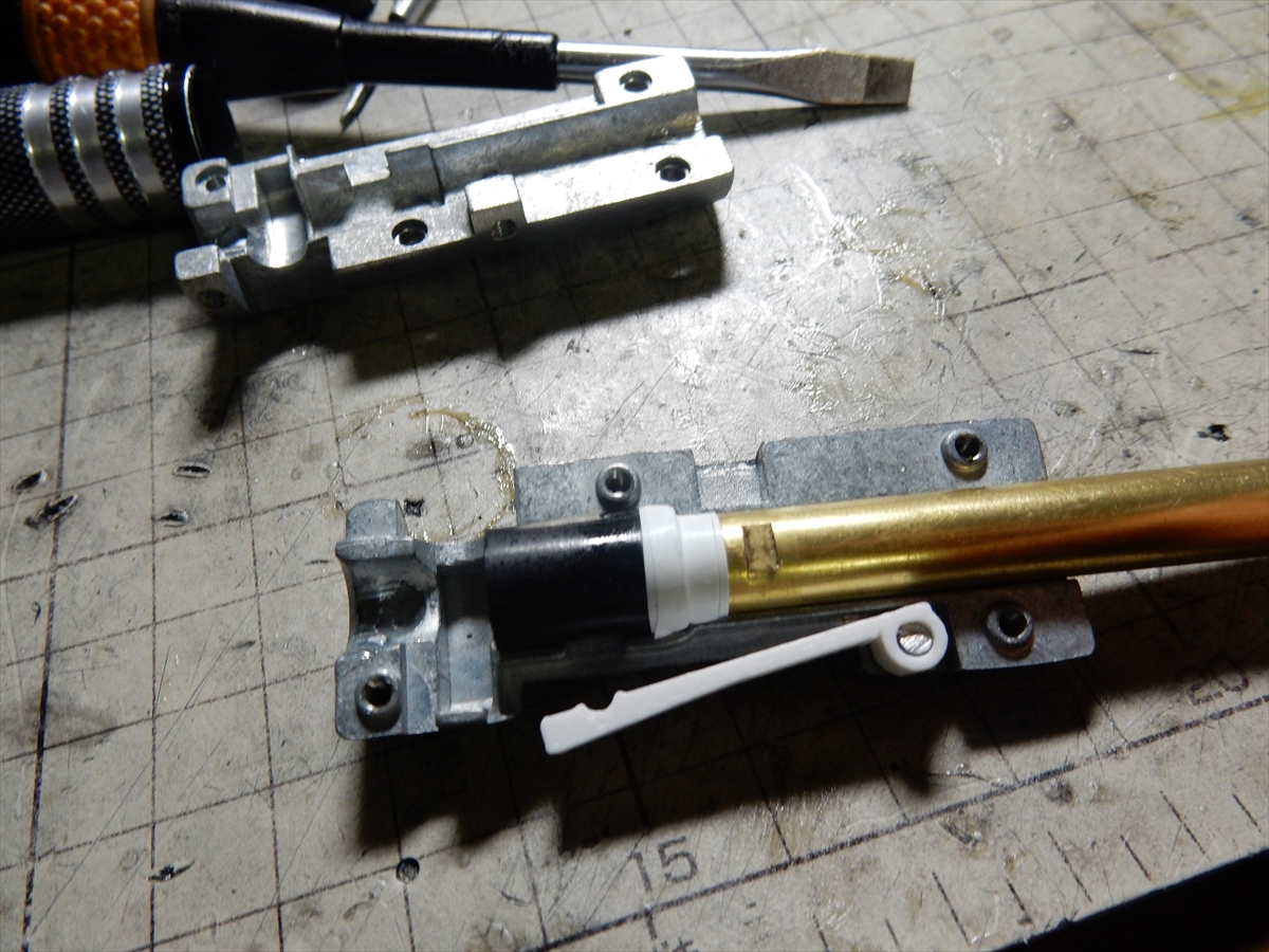 トリガーの軸の左右の0.2mm~0.3mmのシムをしれて遊びを少なくします。