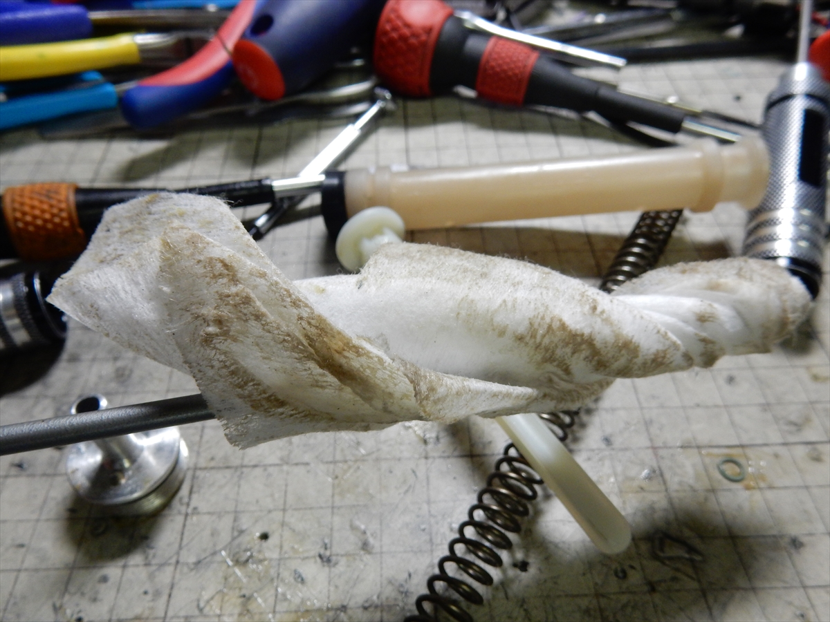 シリンダーですが、内外ともに粘度の高いグリースが使われており、一度ふき取ります。