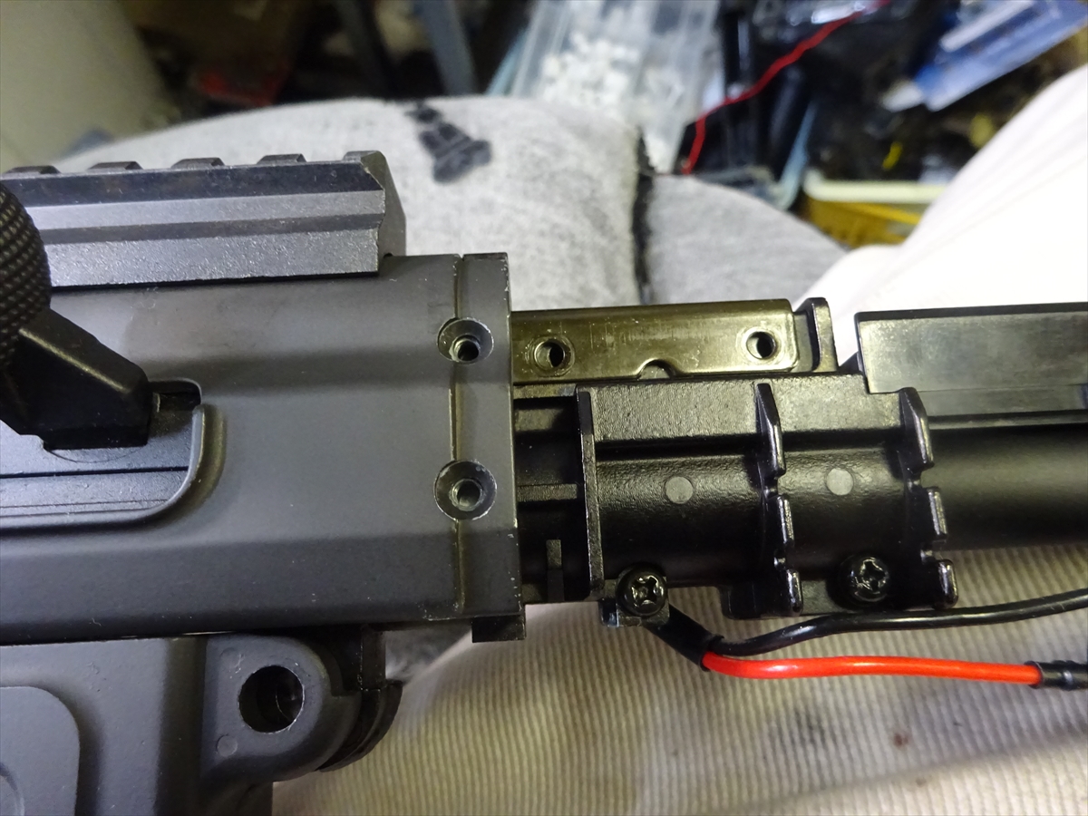 分解方法はいろいろ乗っているので割愛しますが、このフロント部分のピン・ネジ6本を外すと、アッパーレシーバーとバレルが外れます。