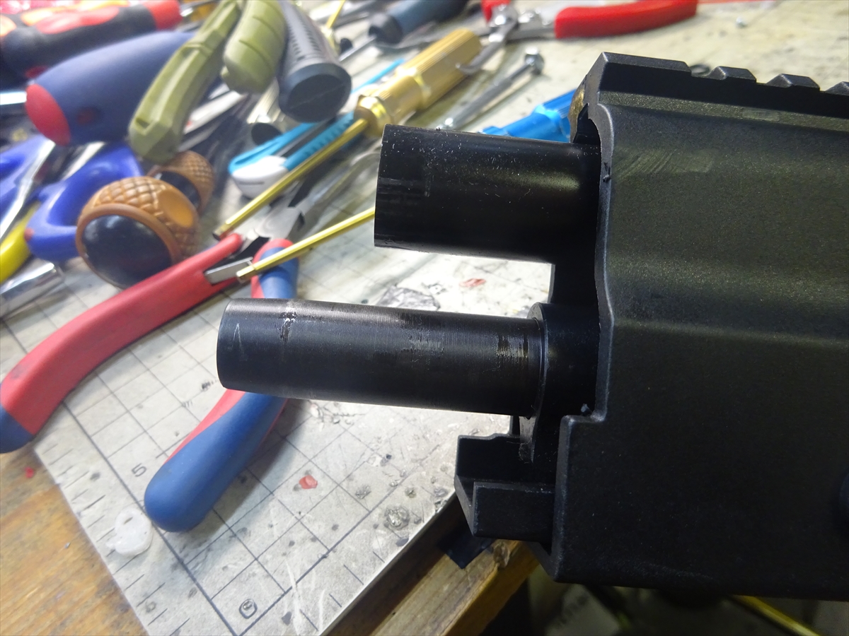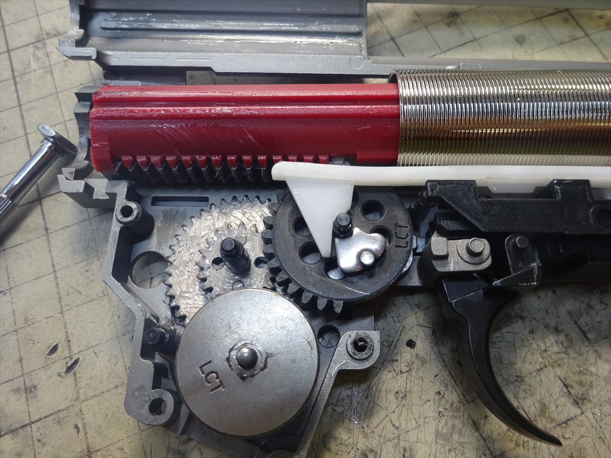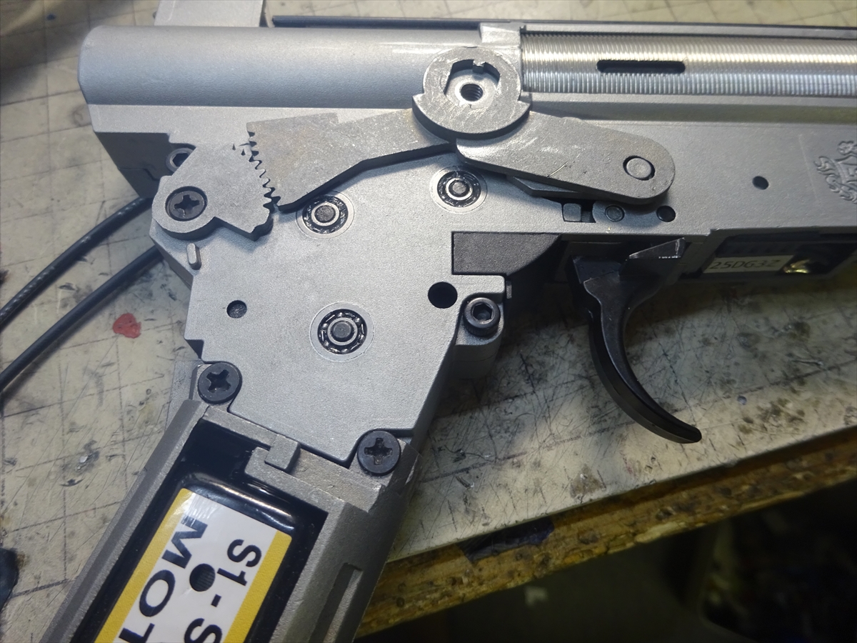 ちなみに後のトラブルで、セレクタープレートの引っかけがなく、セフティに入れ、銃を下等に向けていると自重でセレクターが前進して、セレクターギアが外れる現象がありました。
