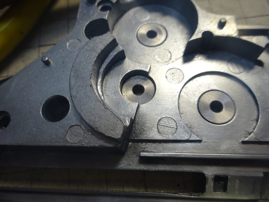 そして、ハイスピード系のギアを組むのであれば、被せる側のスパーギアがここに干渉しますので、削る必要があります。
