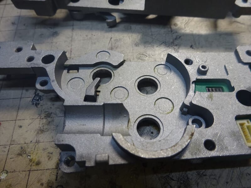 そして、ロアレシーバーのピンを外して、このピンを抜いて、リリースボタンを抜くと、ロアのメカボックスが上方へ外すことができます。