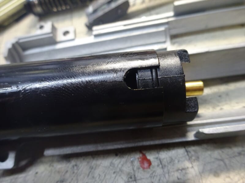 弾が出なかったのは、タペットが折れていると思っていたのですが、原因はこの「超加速シリンダー」でした、圧縮空気をすべてこの穴から出しておりますw
