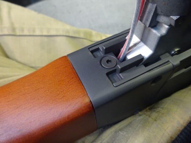 グリップを外して、ここのネジを外すとストックが外れます。