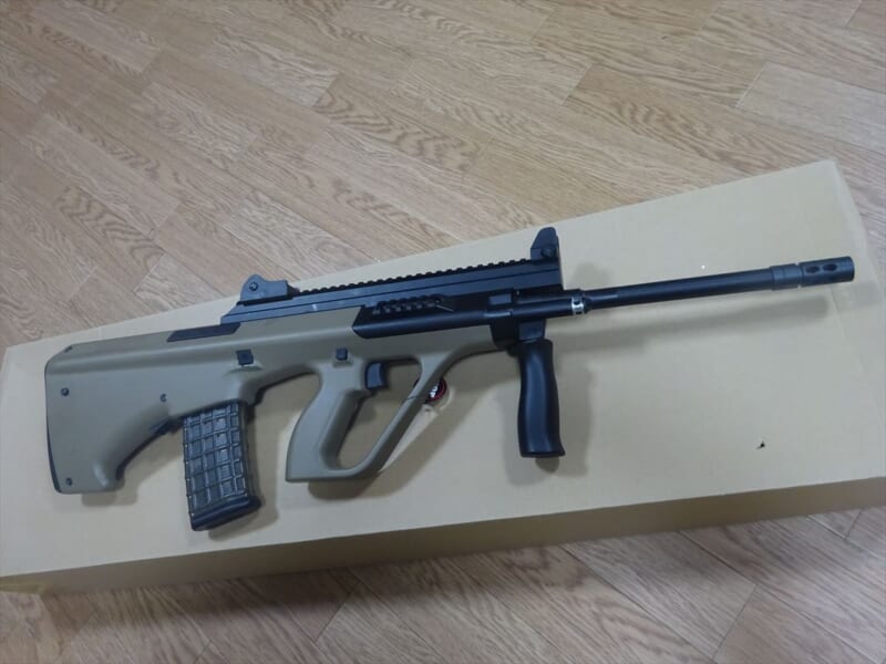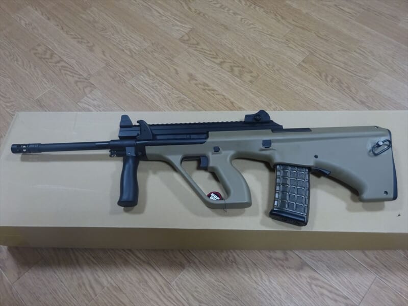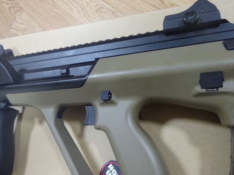 ステアーは軽く引くとセミで深く引くとフルオートになり、セフティーはトリガーの斜め上のスイッチです。