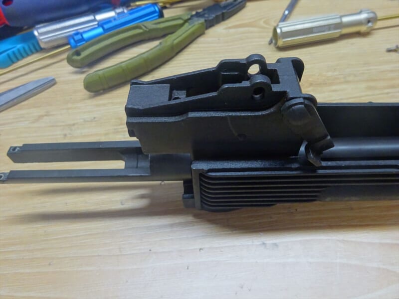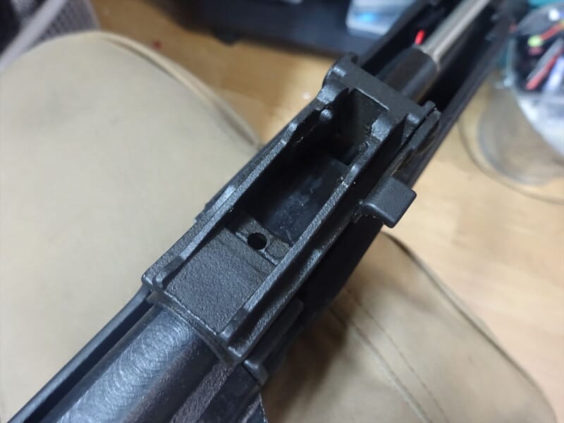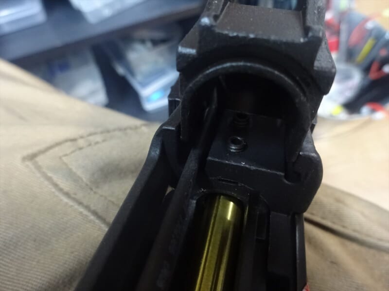 まず、ボルトが外れると言うのは、ピストンにボルトを引っかけるフックが付いており、ボルトがそのフックに掛かり、ピストンの後退と同時にボルトも後退する仕組みなのですが、写真の用にぼるとが上に浮いてフックが外れる事が多々あります。
