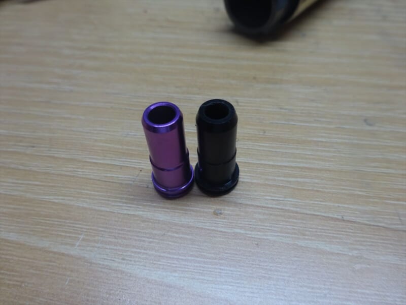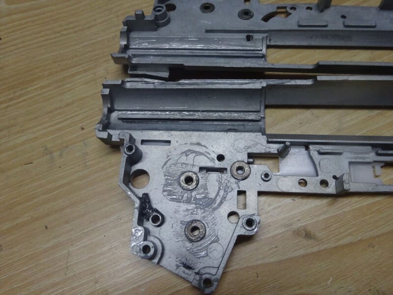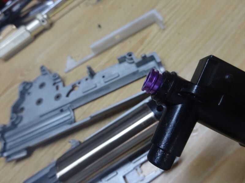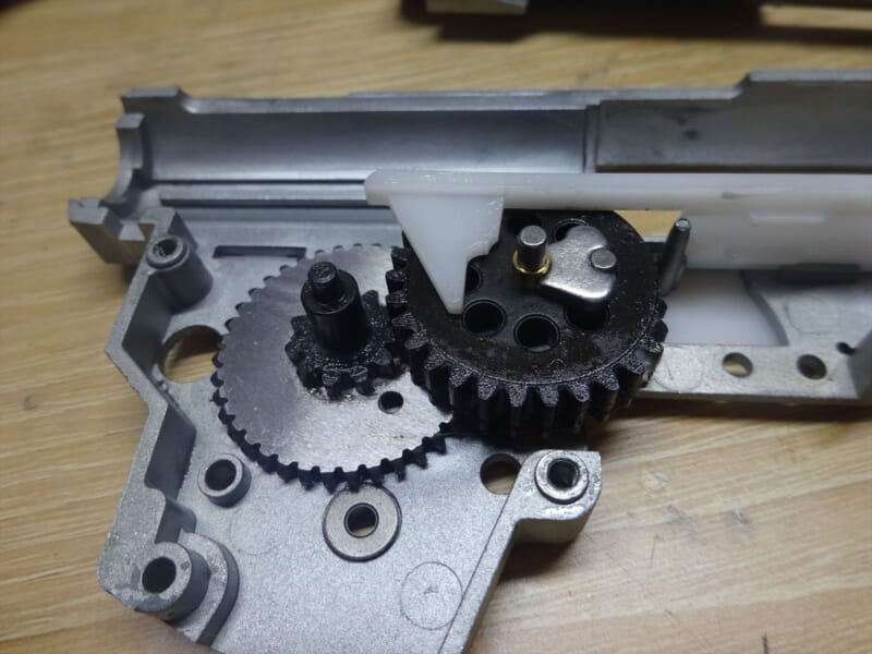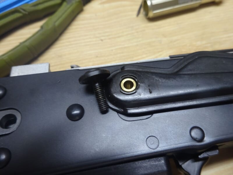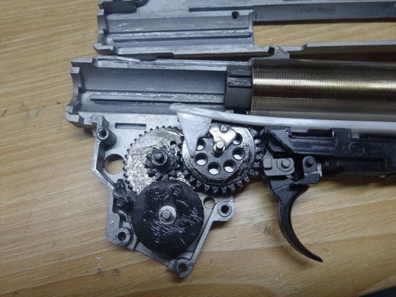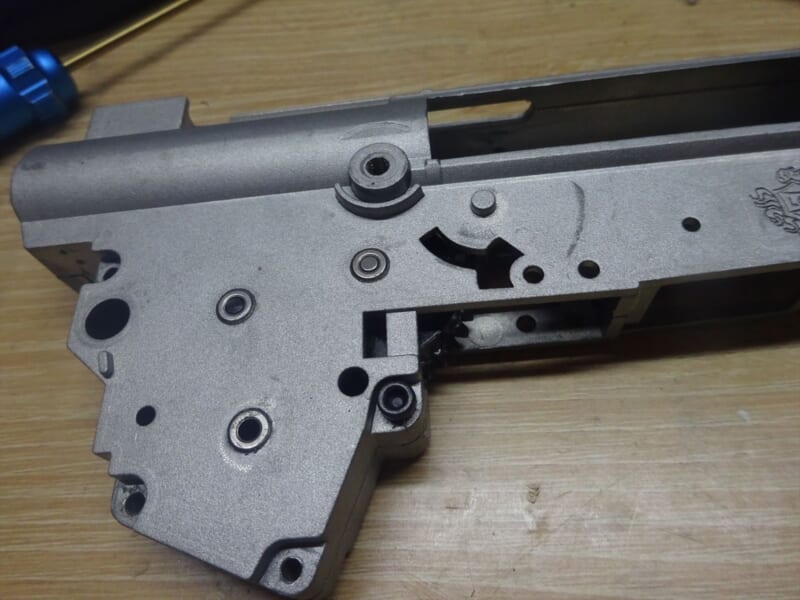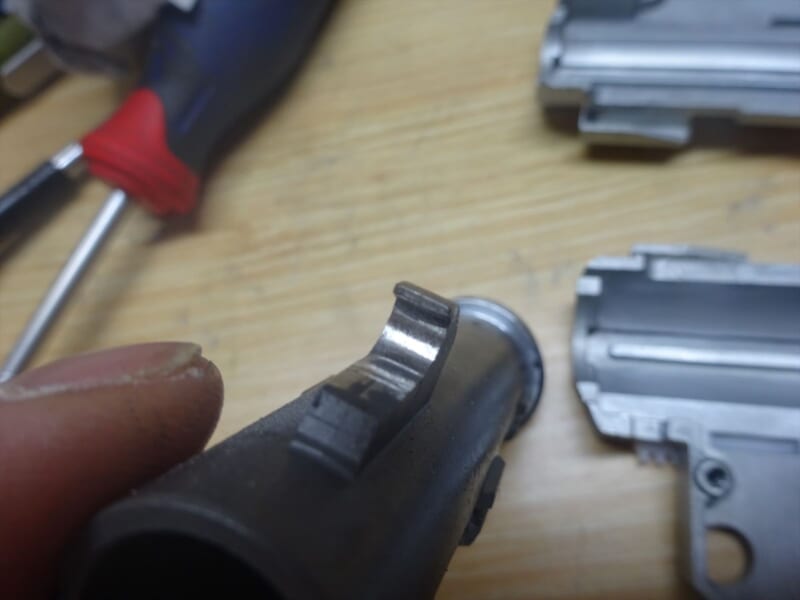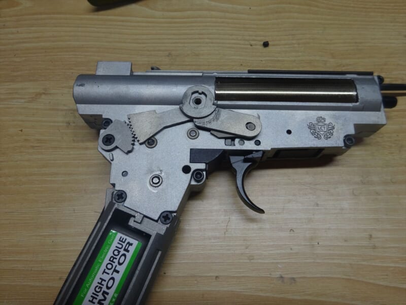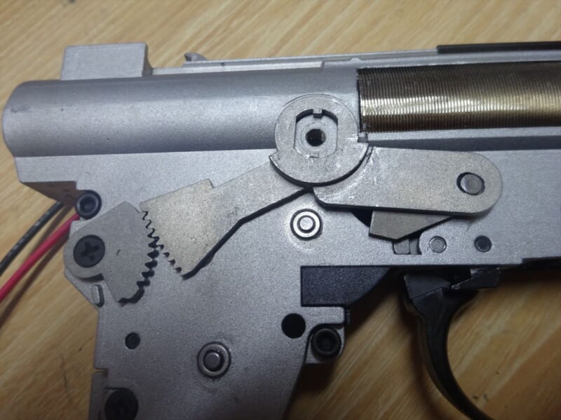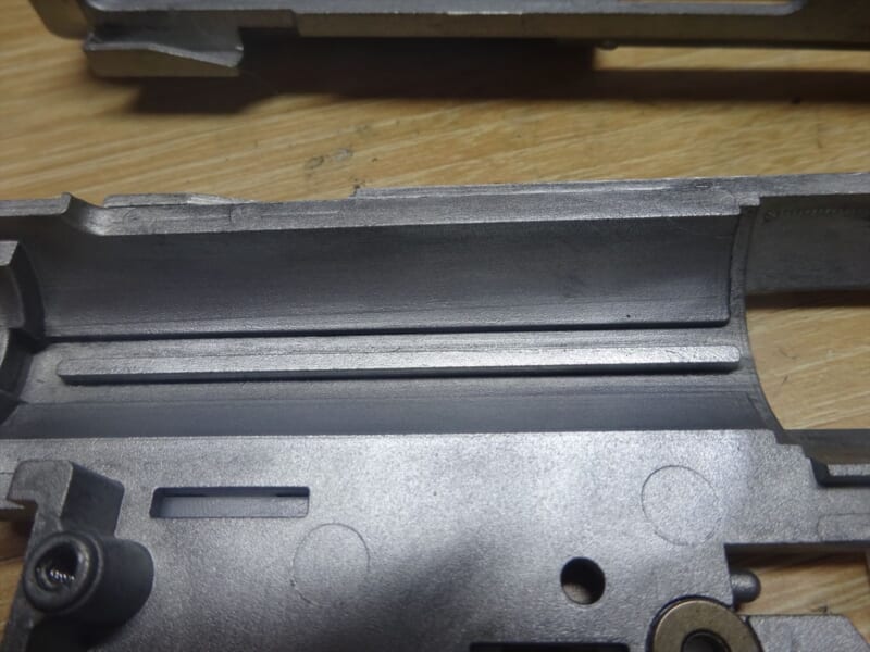 この加工をしていると、仮にピストンがガイドに衝突して停止した場合、ガイドを動かすだけでリリースできますが、加工してないとメカボックスを分解する必要がでます。