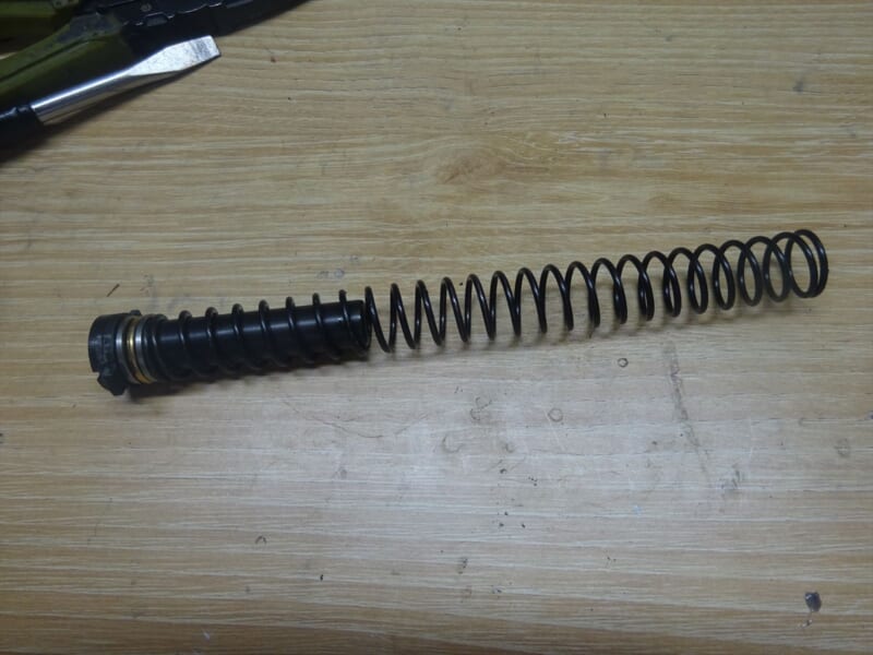 短い理由があり、QDのスプリングガイドになっているのですが、長いスプリングを入れるとこのガイドが上下に動き、ピストンに衝突する場合があるので短くなっています。