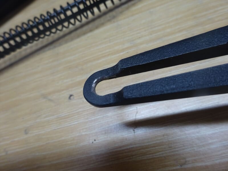 ピストンのフックの部分ですが、角を削って丸みを帯びされる事で一点に力が掛かるのを低減します。