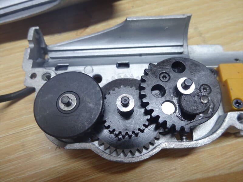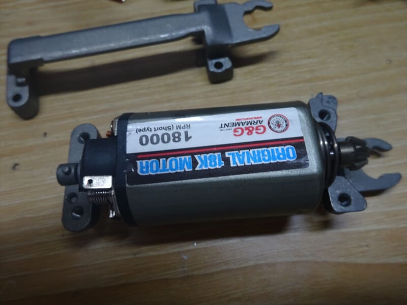 モーターホルダーはメカボックスに対してある程度角度が付けれるようになっているですのが、これは別の電動ガンにも使える用にしている物と思われます。