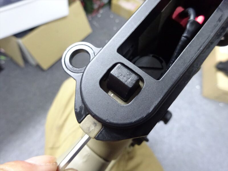 見えにくいですが、この穴に棒を突っ込んで後ろから前に押す感じでストックの解除が出来ます。