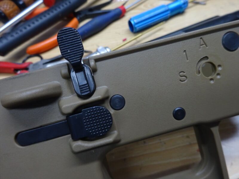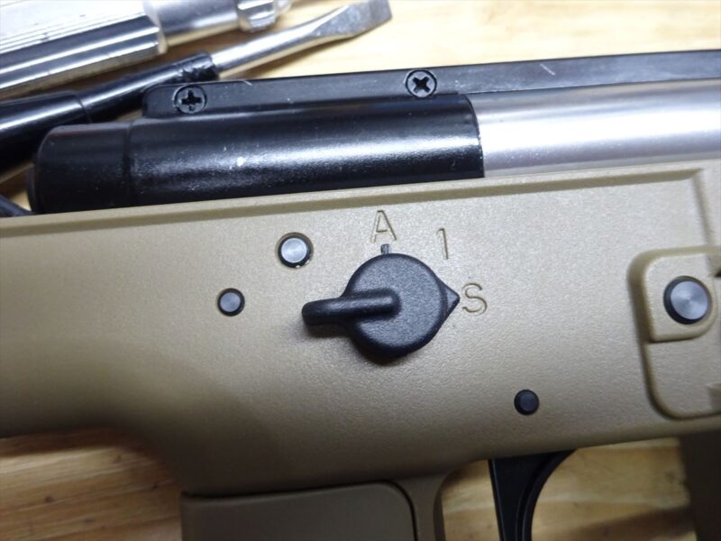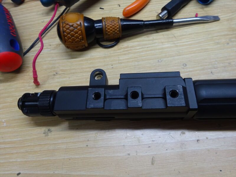 まず分解の基本ですが、アッパーレシーバー左右と、トップにあるネジを外してこのパーツを取ります。