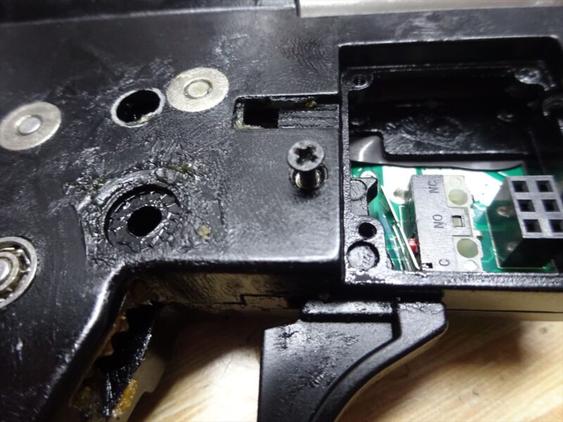 このメカボックスはここにネジがあり反対側にセレクタープレートを制限するピンがあるので、外しておきます。