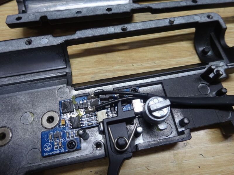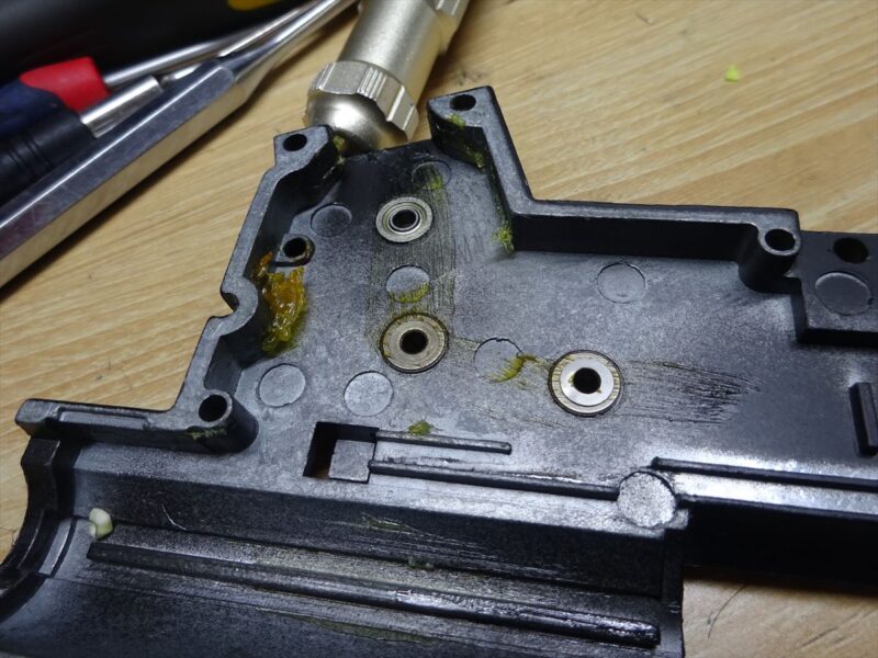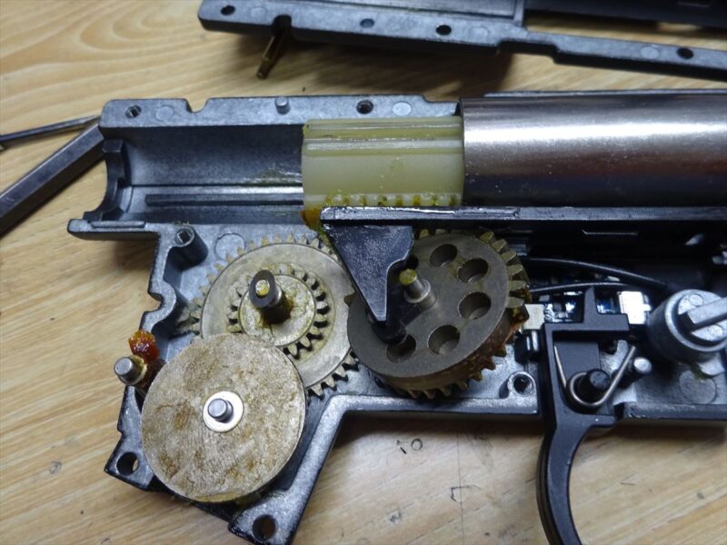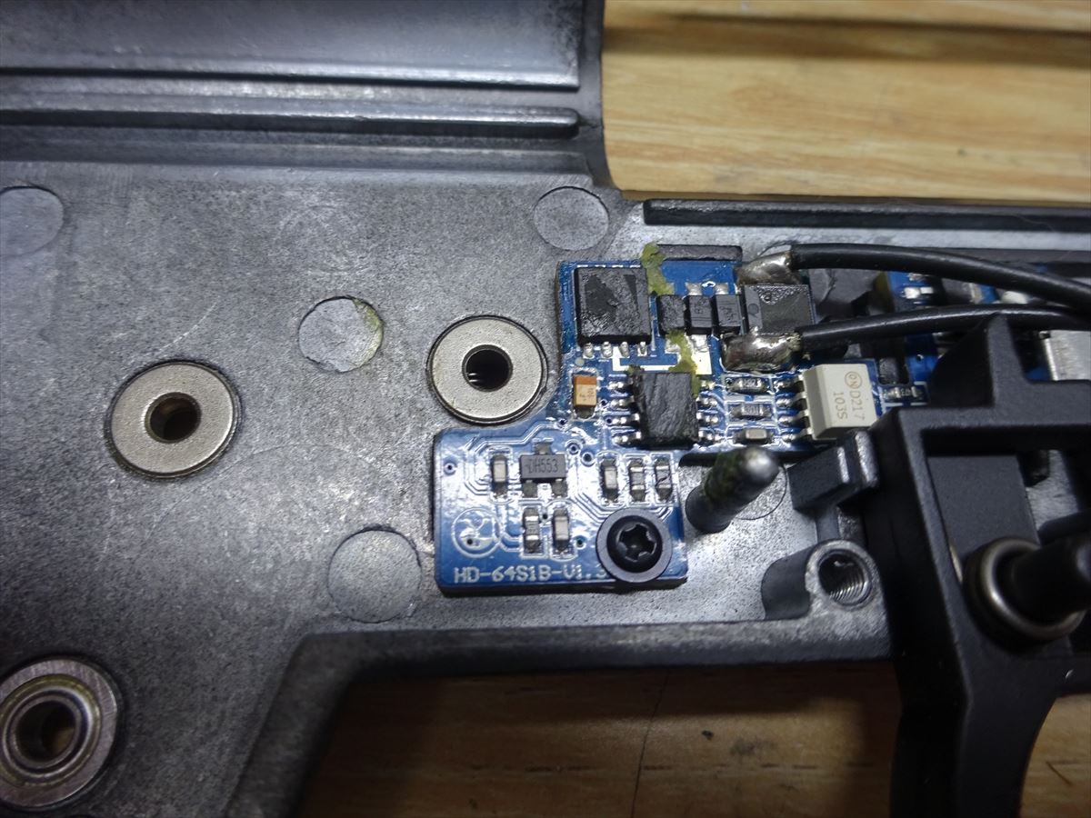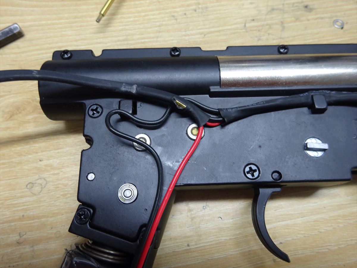 トリガー前方にあるピンを抜くと斜め前に抜けるのですが、モーターがフレームと干渉して抜けにくい場合がありますので、強引に抜かないように。