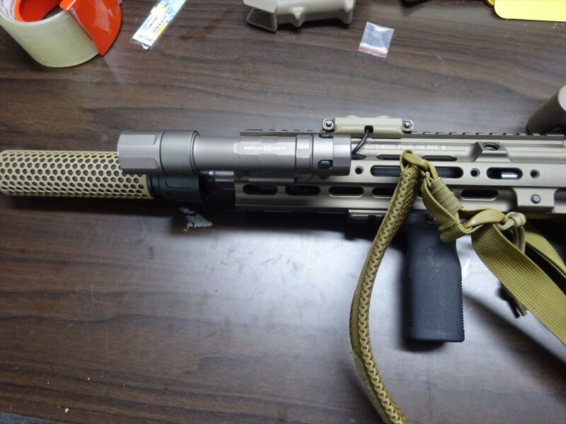 中身はパッキンを交換しているのみで、外装はガイズリー(旧型)ハンドガードにウエポンライトとサプレッサー。グリップとCTRストックを付けています。