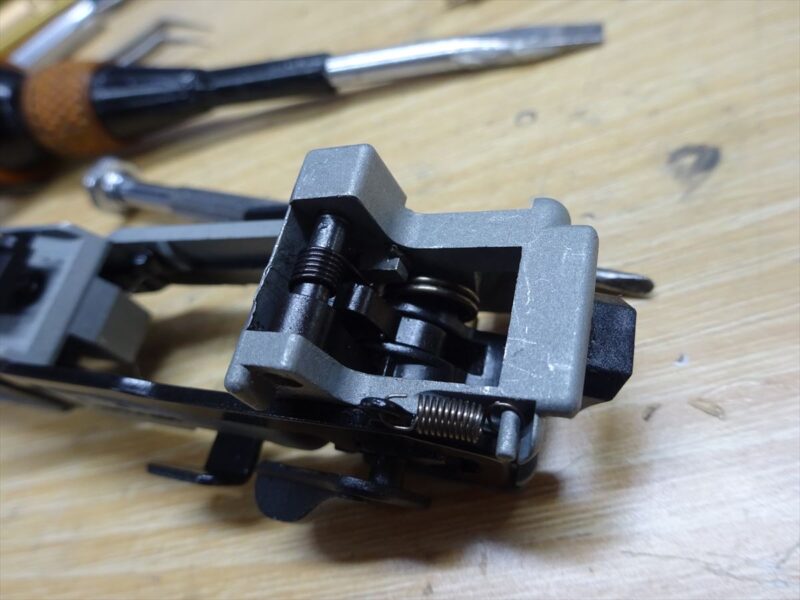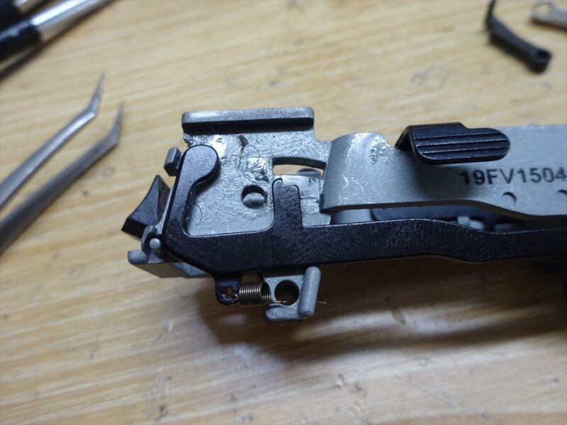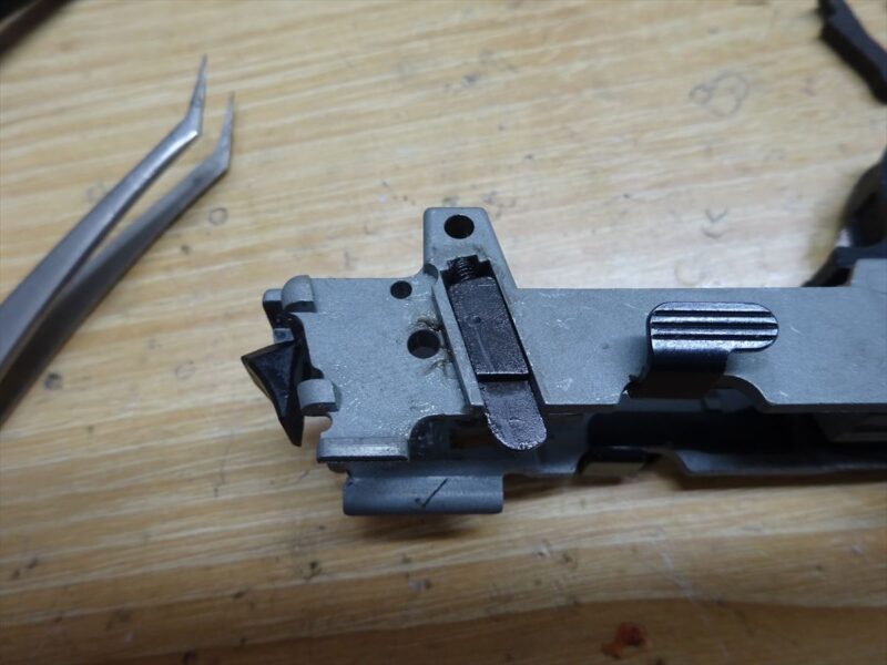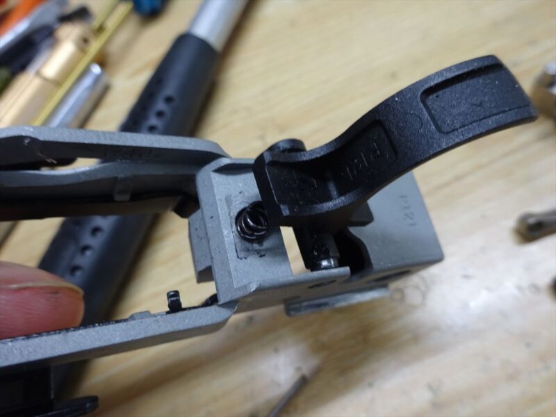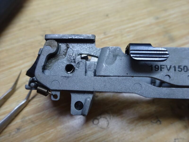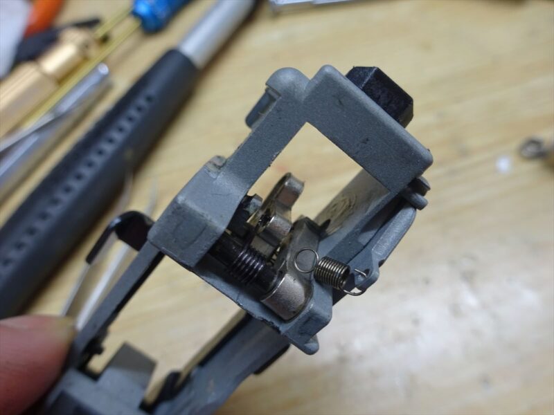 ここでトリガーアームの動きが渋い場合は、削ったり少し曲げ加工が必要な場合があります。