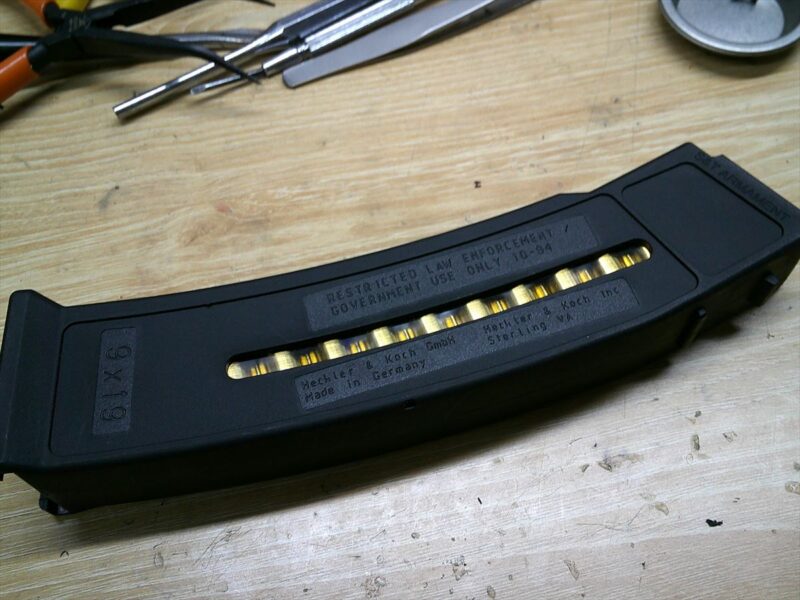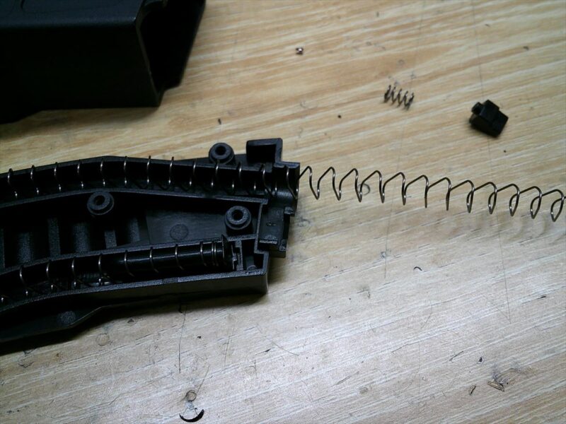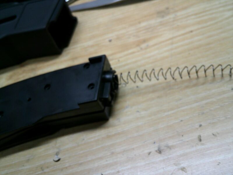 スプリングマガジンの場合、後ろからスプリングが抜けたりできる機構が入っている物がありその場合は比較的メンテが楽なのですが、このマガジンにはそれはついてないです。