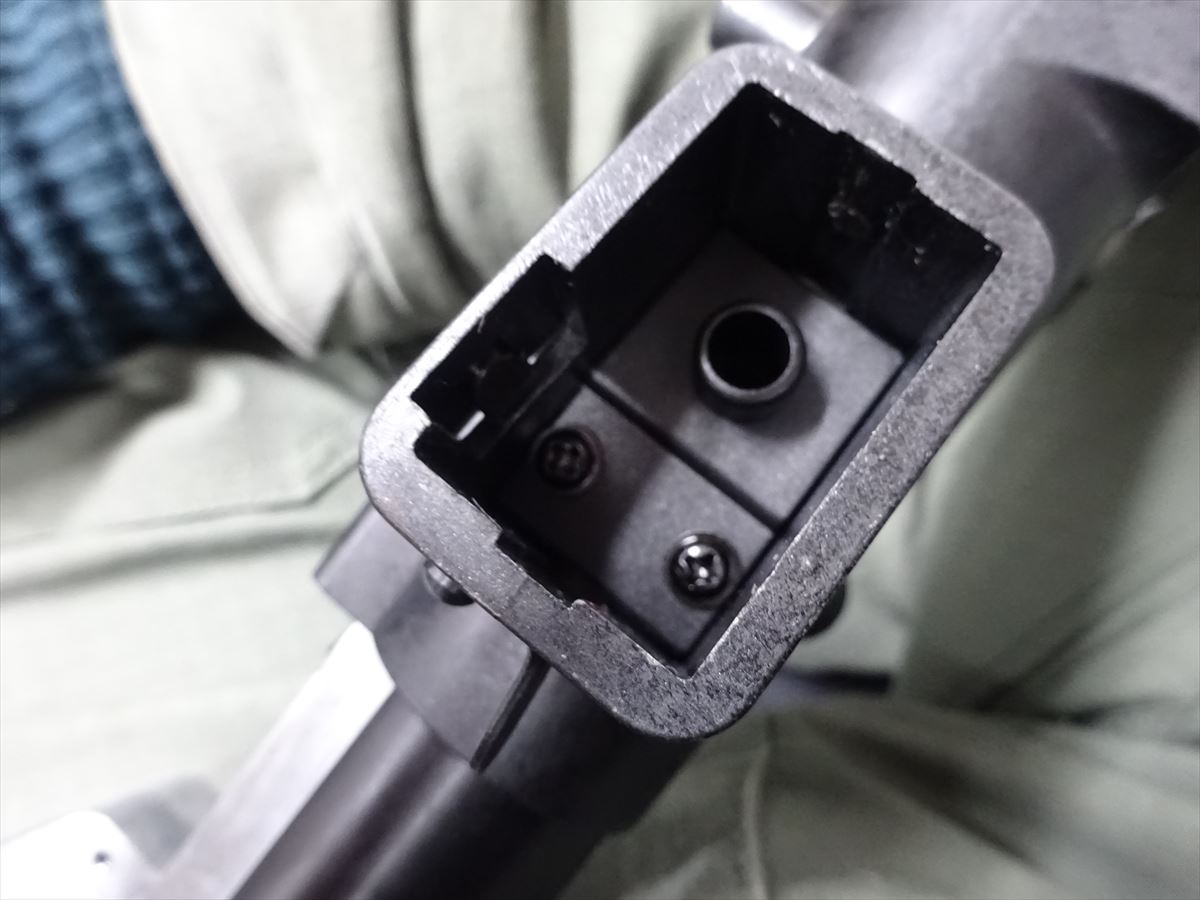 ボルトを引いて、メカボックスとチャンバーを連結しているネジ(下側)を外します。