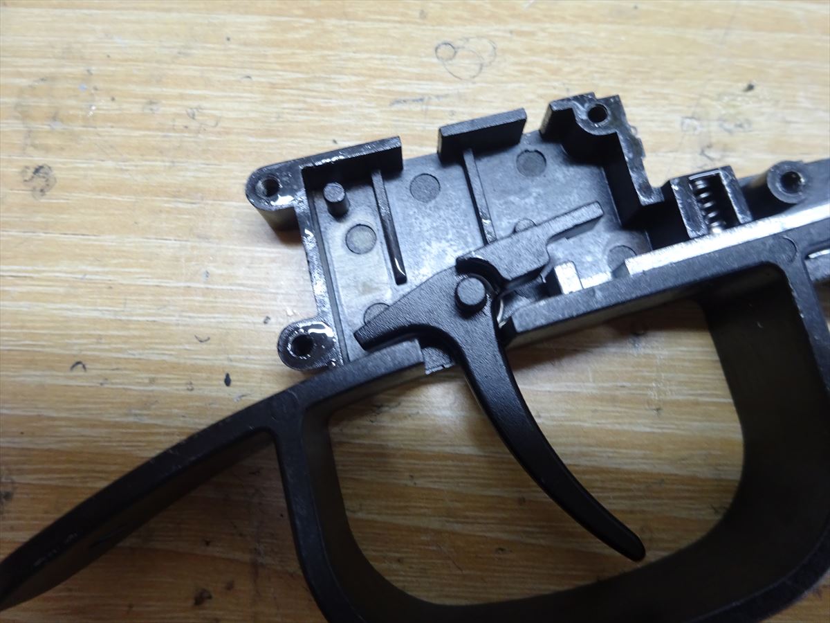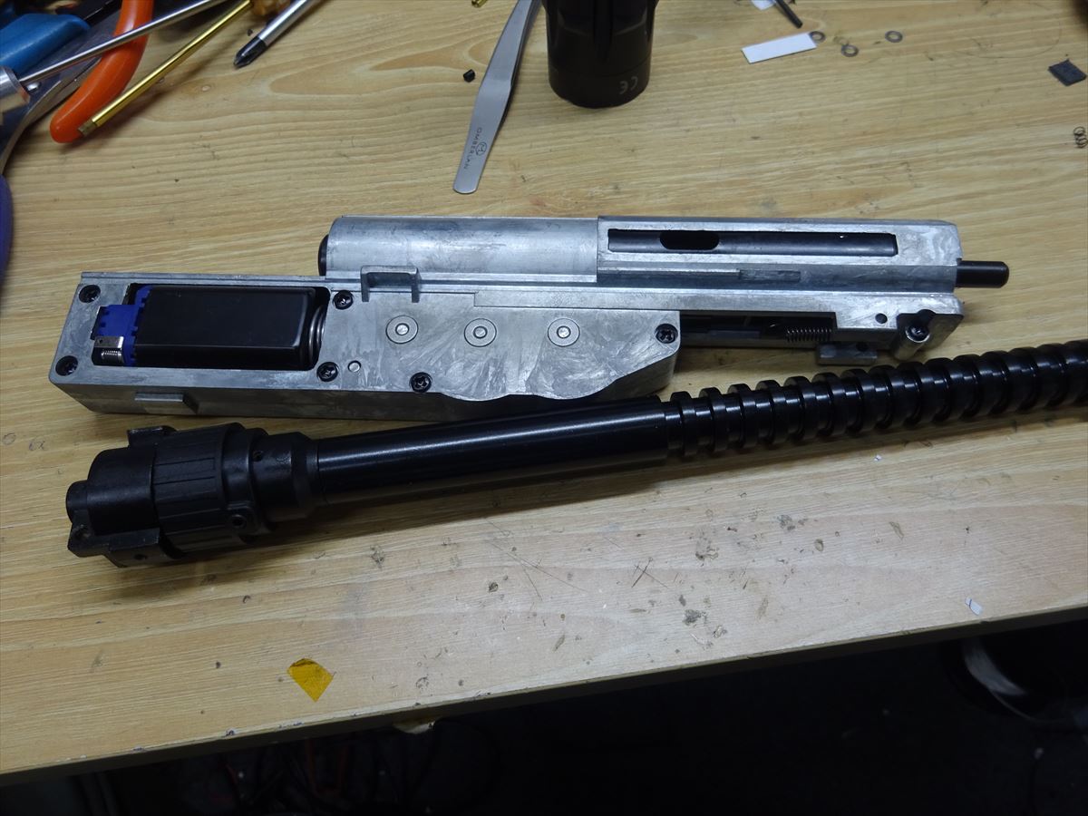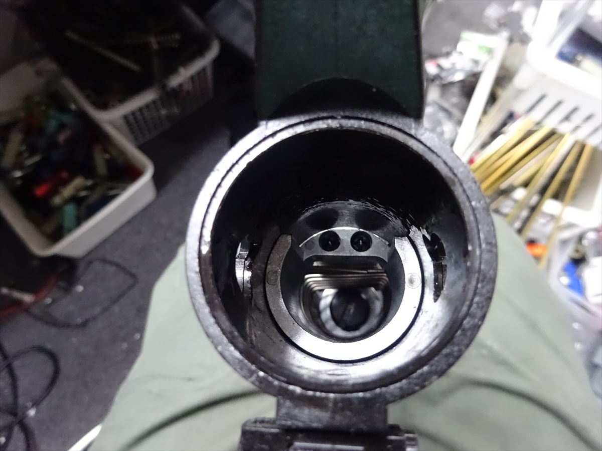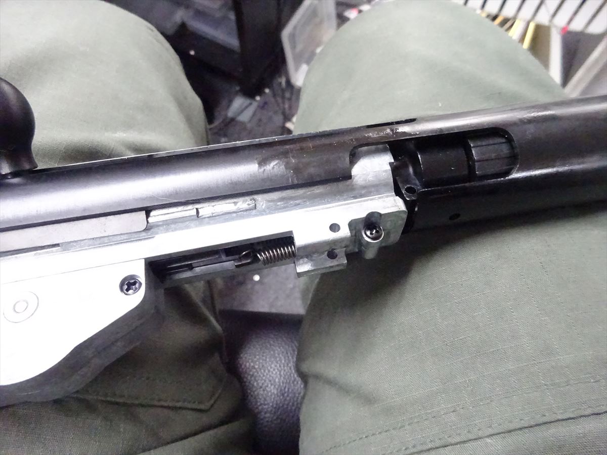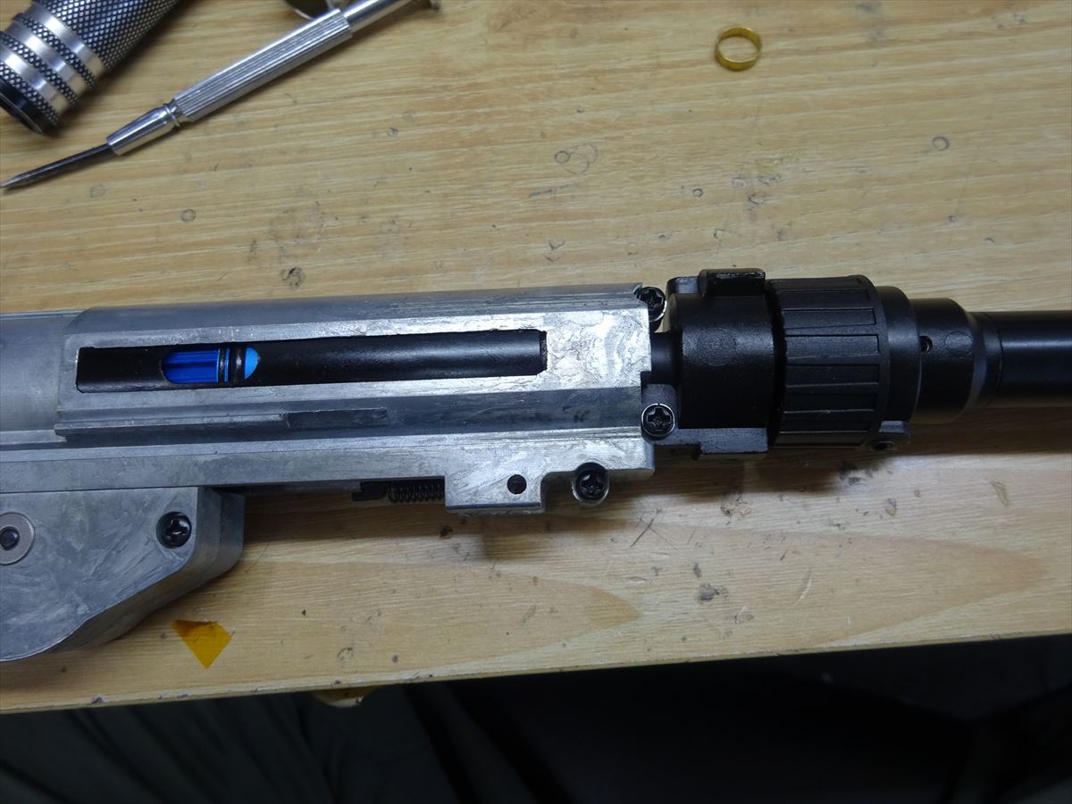 ボルトを外してボルトカバーを抜くとチャンバーは後方から抜けますが、バレル周りを外していると前方から抜けるのでそちらの方が楽です。
