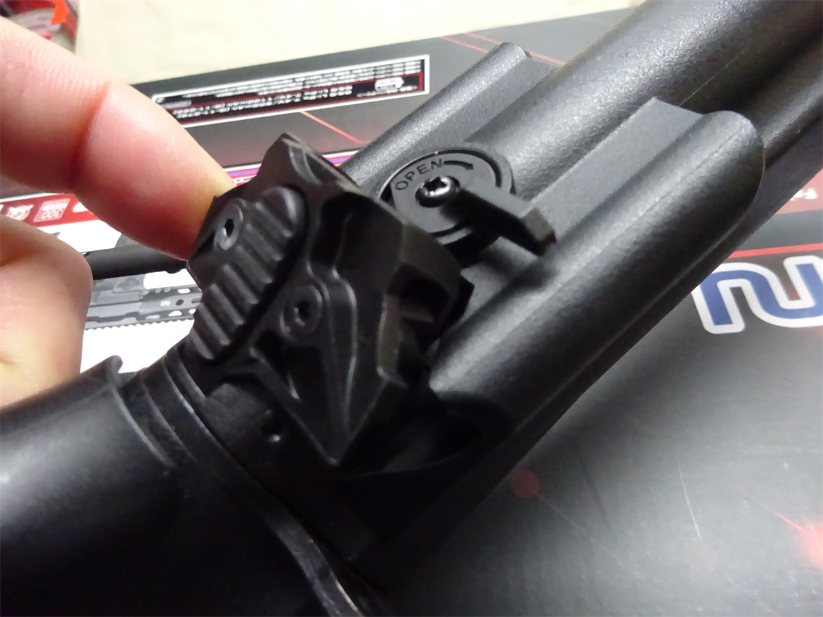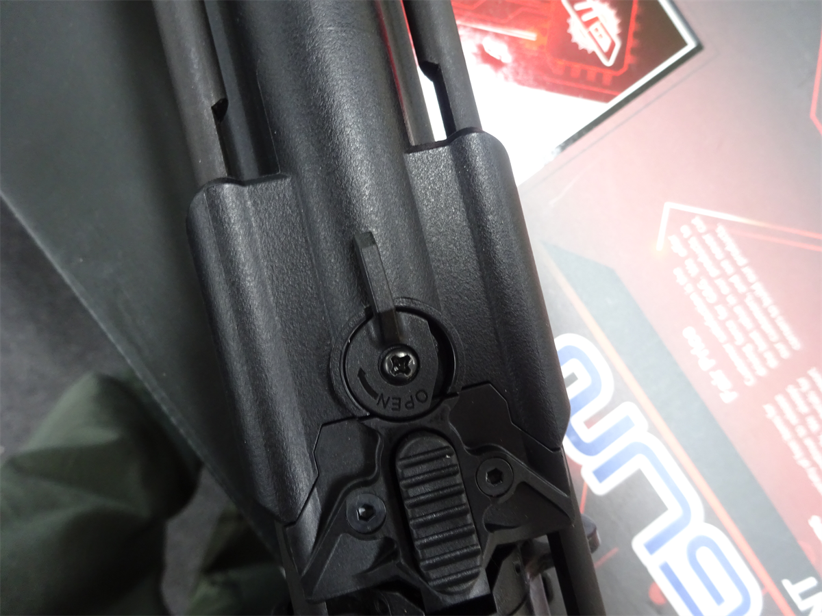 ストックはクレーンタイプで、後方のこのレバーで伸ばす事が出来ます。