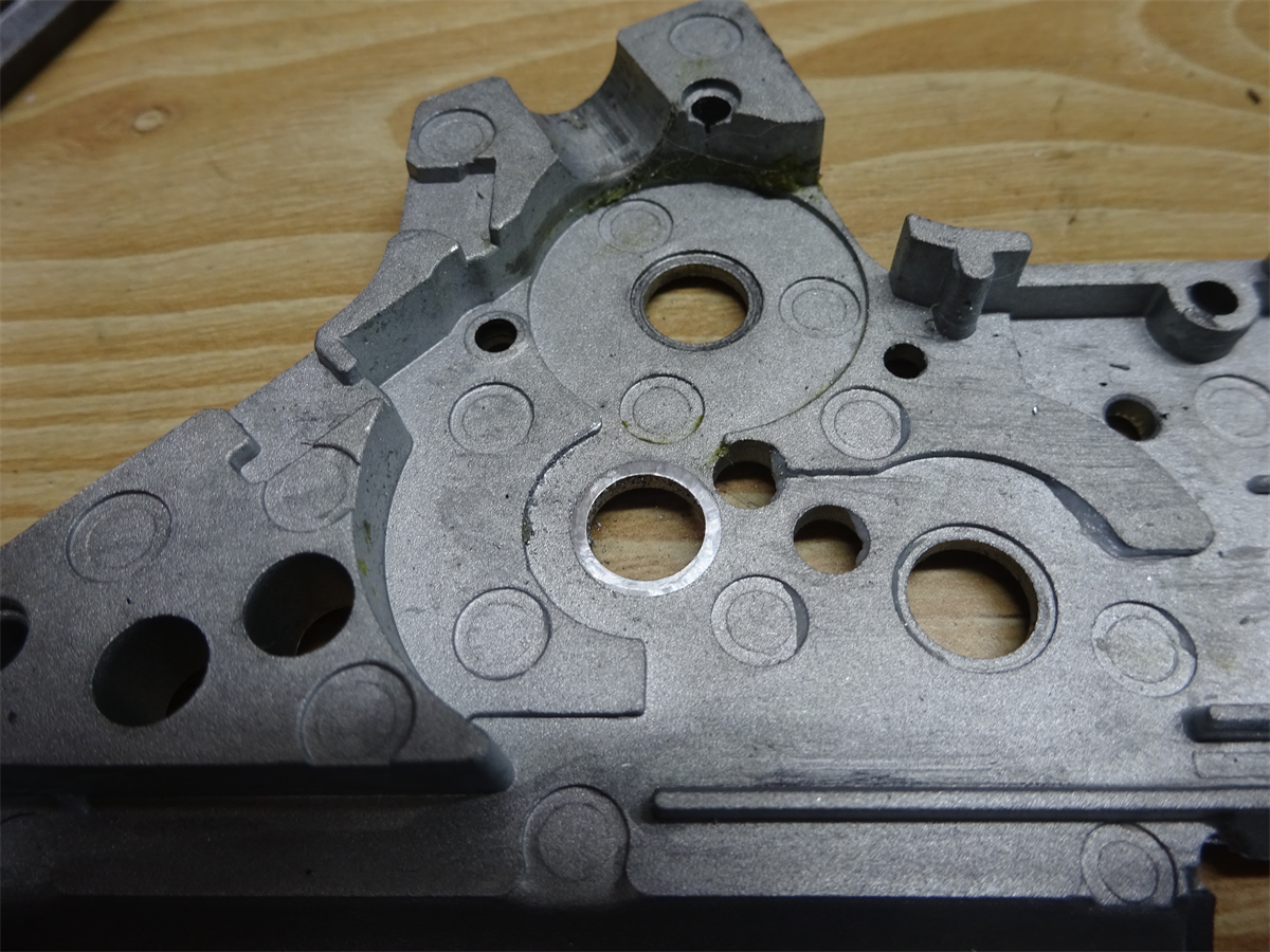 まず、このG2メカボックスの特徴として、スパーギアの軸受けの所が、盛り上がっており、通常の軸受けを付けるとキツすぎてギアが回りません。